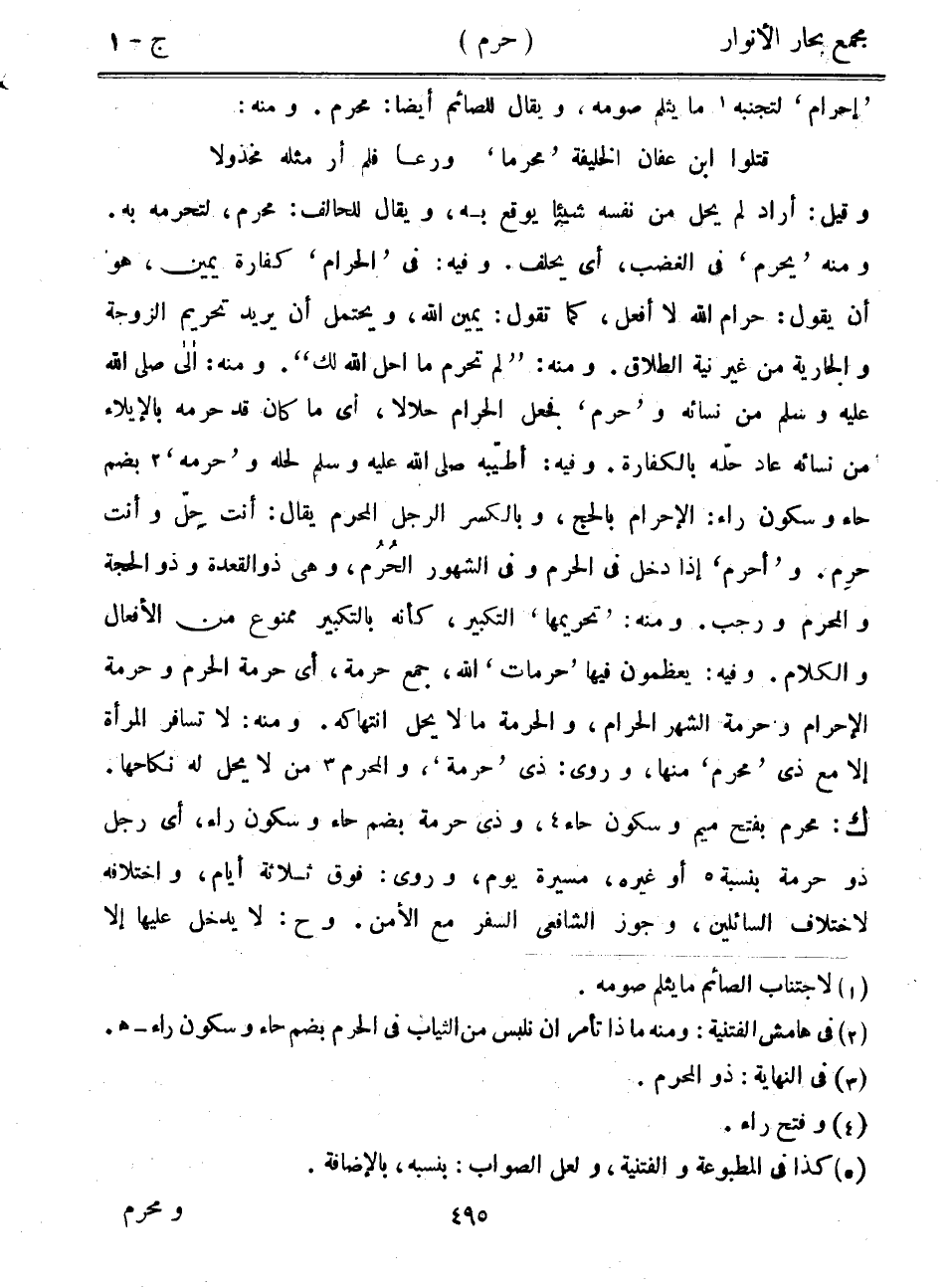 وقيل: أراد لم يحل من نفسه شيئاً يوقع به، ويقال للحالف: محرم، لتحرمه به. ومنه "يحرم" في الغضب، أي يخلف. وفيه: في "الحرام" كفارة يمين، هو أن يقول: حرام الله لا أفعل، كما تقول: يمين الله، ويحتمل أن يريد تحريم الزوجة والجارية من غير نية الطلاق. ومنه: "لم تحرم ما أحل الله لك". ومنه: إلى صلى الله عليه وسلم من نسائه و"حرم" فجعل الحرام حلالاً، أي ما كان قد حرمه بالإيلاء من نسائه عاد حله بالكفارة. وفيه: أطيبه صلى الله عليه وسلم لحله و"حرمه" بضم حاء وسكون راء: الإحرامب الحج، وبالكسر الرجل المحرم يقال: أنت حل وأنت حرم. و"أحرم" إذا دخل في الحرم وفي الشهور الحرم، وهي ذو القعدة وذو الحجة والمحرم ورجب. ومنه: "تحريمها" التكبير، كأنه بالتكبير ممنوع من الأفعال والكلام. وفيه: يعظمون فيها "حرمات" الله، جمع حرمة، أي حرمة الحرم وحرمة الإحرام وحرمة الشهر الحرام، والحرمة ما لا يحل انتهاكه. ومنه: لا تسافر المرأة إلا مع ذي "محرم" منها، وروى: ذي "حرمة"، والمحرم من لا يحل له نكاحها. ك: محرم بفتح ميم وسكون حاء، وذي حرمة بضم حاء وسكون راء، أي رجل ذو حرمة بنسبة أو غيره، مسيرة يوم، وروى: فوق ثلاثة أيام، واختلافه لاختلاف السائلين، وجوز الشافعي السفر مع الأمن. وح: لا يدخل عليها إلا