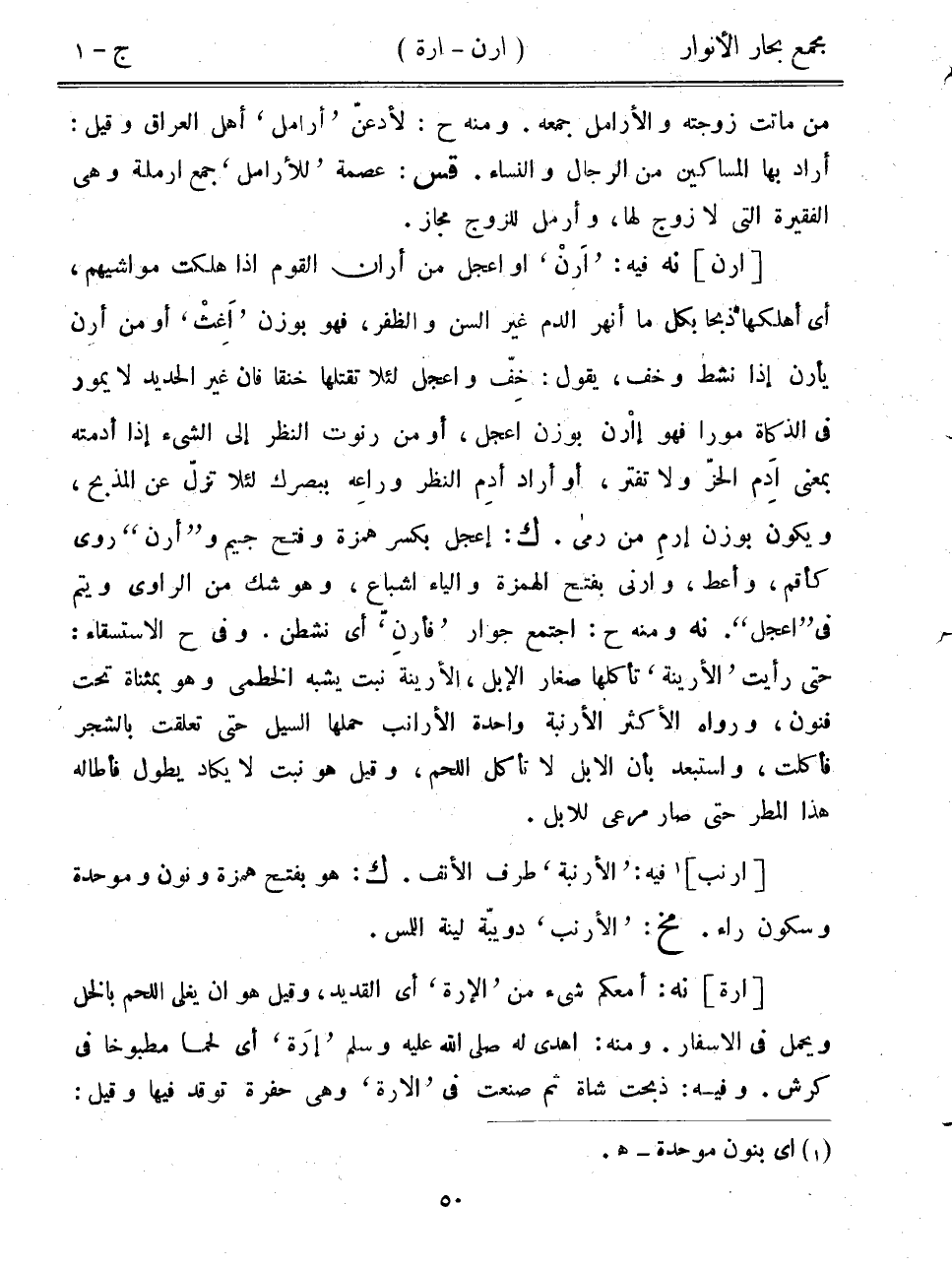 [أرن] نه فيه: "أرن" أو أعجل من أران القوم إذا هلكت مواشيهم، أي أهلكها ذبحاً بكل ما أنهر الدم غير السن والظفر، فهو بوزن "أغث" أو من أرن يأرن إذا نشط وخف، يقول: خف وأعجل لئلا تقتلها خنقاً فإن غير الحديد لا يمور في الذكاة موراً فهو إأرن بوزن أعجل، أو من رنوت النظر إلى الشيء إذا أدمته بمعنى أدم الخز ولا تفتر، أو أراد أدم النظر وراعه ببصرك لئلا تزل عن المذبح، ويكون بوزن إرم من رمى. ك: إعجل بكسر همزة وفتح جيم و"أرن" روى كأقم، وأعط، وأرني بفتح الهمزة والياء إشباع، وهو شك من الراوي ويتم في "أعجل". نه ومنه ح: اجتمع حوار "فأرن" أي نشطن. وفي ح الاستسقاء: حتى رأيت "الأرينة" تأكلها صغار الإبل، الأرينة نبت يشبه الخطمي وهو بمثناة تحت فنون، ورواه الأكثر الأرنبة واحدة الأرانب حملها السيل حتى تعلقت بالشجر فأكلت، واستبعد بأن الإبل لا تأكل اللحم، وقيل هو نبت لا يكاد يطول فأطاله هذا المطر حتى صار مرعى للإبل.