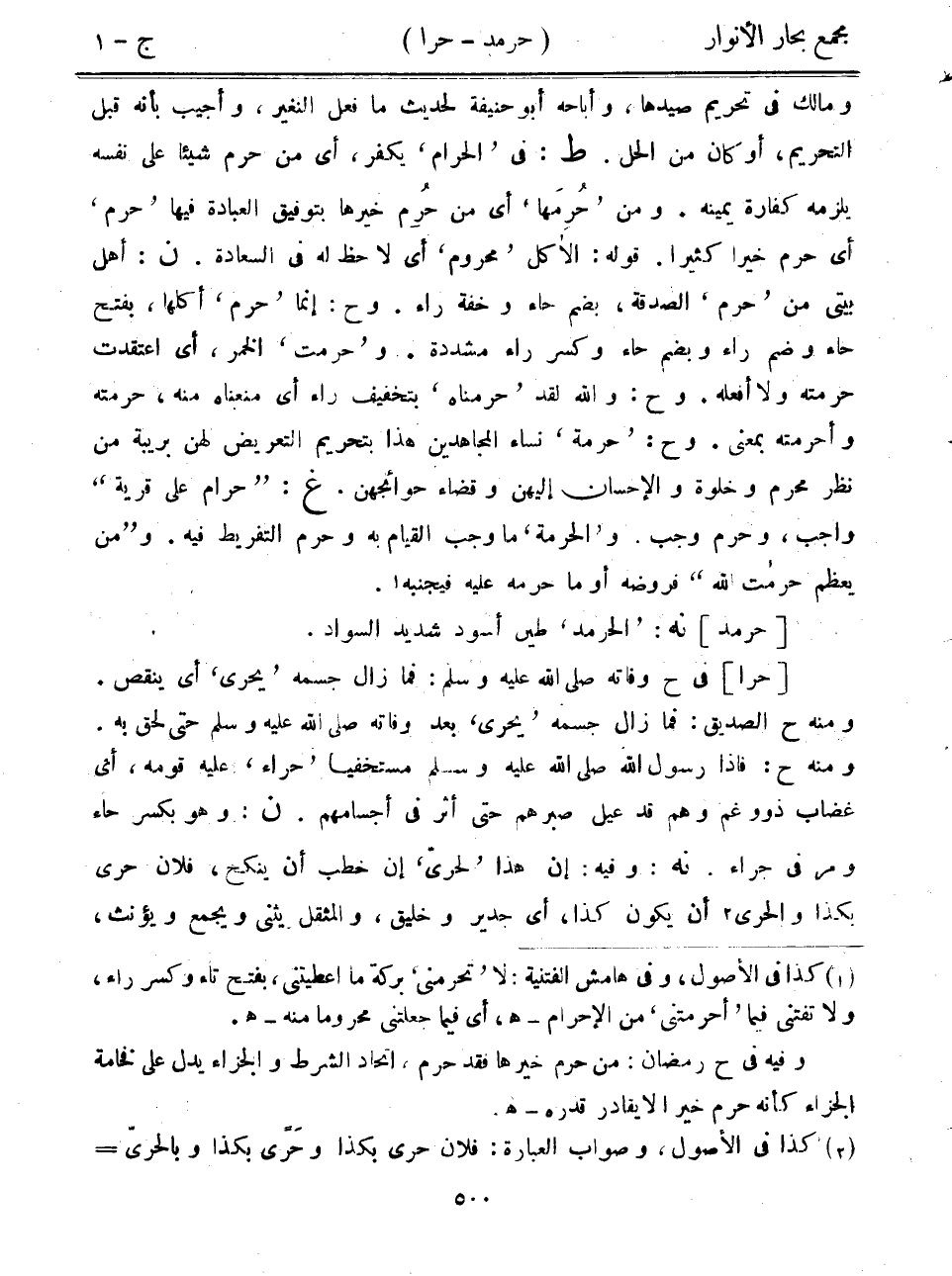 ومالك في تحريم صيدها، وأباحه أبو حنيفة لحديث ما فعل النغير، وأجيب بأنه قبل التحريم، أو كان من الحل. ط: في "الحرام" يكفر، أي من حرم شيئاً على نفسه يلزمه كفارة يمينه. ومن "حرمها" أي من حرم خيرها بتوفيق العبادة فيها "حرم" أي حرم خيراً كثيراً. قوله: الأكل "محروم" أي لا حظ له في السعادة. ن: أهل بيتي من "حرم" الصدقة، بضم حاء وخفة راء. وح: إنما "حرم" أكلها، بفتح حاء وضم راء وبضم حاء وكسر راء مشددة. و"حرمت" الخمر، أي اعتقدت حرمته ولا أفعله. وح: والله لقد "حرمناه" بتخفيف راء أي منعناه منه، حرمته وأحرمته بمعنى. وح: "حرمة" نساء المجاهدين هذا بتحريم التعريض لهن بريبة من نظر محرم وخلوة والإحسان إليهن وقضاء حوائجهن. غ: "حرام على قرية" واجب، وحرم وجب. و"الحرمة" ما وجب القيام به وحرم التفريط فيه. و"من يعظم حرمات الله" فروضه أو ما حرمه عليه فيجنبه.