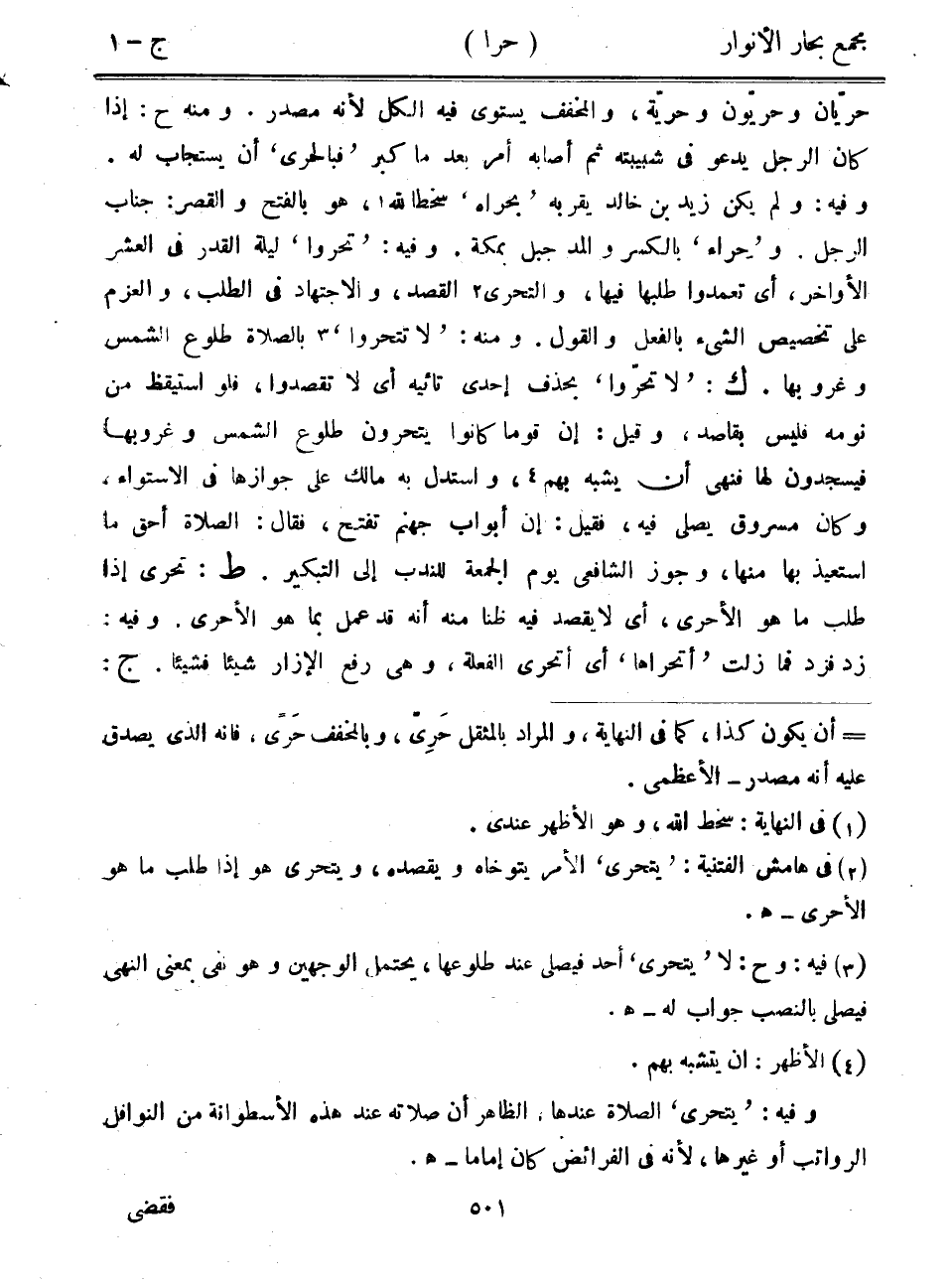 حريان وحريون وحرية، والمخفف يستوي فيه الكل لأنه مصدر. ومنه ح: إذا كان الرجل يدعو في شبيبته ثم أصابه أمر بعد ما كبر "فبالحرى" أن يستجاب له. وفيه: ولم يكن زيد بن خالد يقربه "بحراه" سخطاً لله، هو بالفتح والقصر: جناب الرجل. و"حراء" بالكسر والمد جبل بمكة. وفيه: "تحروا" ليلة القدر في العشر الأواخر، أي تعمدوا طلبها فيها، والتحري القصد، والاجتهاد في الطلب، والعزم على تخصيص الشيء بالفعل والقول. ومنه: "لا تتحروا" بالصلاة طلوع الشمس وغروبها. ك: "لا تحروا" بحذف إحدى تائيه أي لا تقصدوا، فلو استيقظ من نومه فليس بقاصد، وقيل: إن قوماً كانوا يتحرون طلوع الشمس وغروبها فيسجدون لها فنهى أن يشبه بهم، واستدل به مالك على جوازها في الاستواء، وكان مسروق يصلي فيه، فقيل: إن أبواب جهنم تفتح، فقال: الصلاة أحق ما استعيذ بها منها، وجوز الشافعي يوم الجمعة للندب إلى التبكير. ط: تحرى إذا طلب ما هو الأحرى، أي لا يقصد فيه ظناً منه أنه قد عمل بما هو الأحرى. وفيه: زد فزد فما زلت "أتحراها" أي أتحرى الفعلة، وهي رفع الإزار شيئاً فشيئاً. ج:
