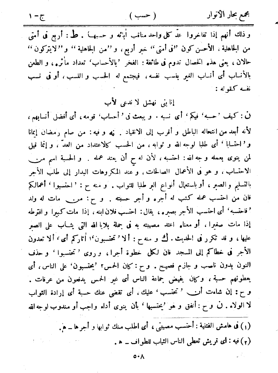 ن: كيف "حسبه" فيكم" أي نسبه. ويبعث في "أحساب" قومه، أي أفضل أنسابهم، لأنه أبعد من انتحاله الباطل وأقرب إلى الانقياد. نه وفيه: من صام رمضان إيماناً و"احتساباً" أي طلباً لوجه الله وثوابه، من الحسب كالاعتداد من العد، وإنما قيل لمن ينوي بعمله وجه الله: احتسبه، لأن له ح أن يعتد عمله. والحسبة اسم من الاحتساب، وهو في الأعمال الصالحات، وعند المكروهات البدار إلى طلب الأجر بالتسليم والصبر، أو باستعمال أنواع البر طلباً للثواب. ومنه ح: "احتسبوا" أعمالكم فإن من احتسب عمله كتب له أجره وأجر حسبته. وح: من مات له ولد "فاحتسبه" أي احتسب الأجر بصبره، يقال: احتسب فلان ابنه، إذا مات كبيراً وافترطه إذا مات صغيراً، أو معناه اعتد مصيبته به في جملة بلايا الله التي يثاب على الصبر عليها، وقد تكرر في الحديث. ك ومنه ح: ألا "تحتسبون" آثاركم أي" ألا تعدون الأجر في خطاكم إلى المسجد فإن لكل خطوة أجراً، وروى "تحتسبوا" وحذف النون بدون ناصب وجازم فصيح. وح: كان الحمس "يحتسبون" على الناس، أي يعطونهم حسبة، وكنا يفيض جماعة الناس أي غير الحمس يدفعون من عرفات. وح: إن شاءت أن "تحتسب" عليك، أي تقضى عنك حسبة أي إرادة الثواب لا الولاء. ن وح: أنفق وهو "يحتسبها" بأن ينوي أداء واجب أو مندوب لوجه الله