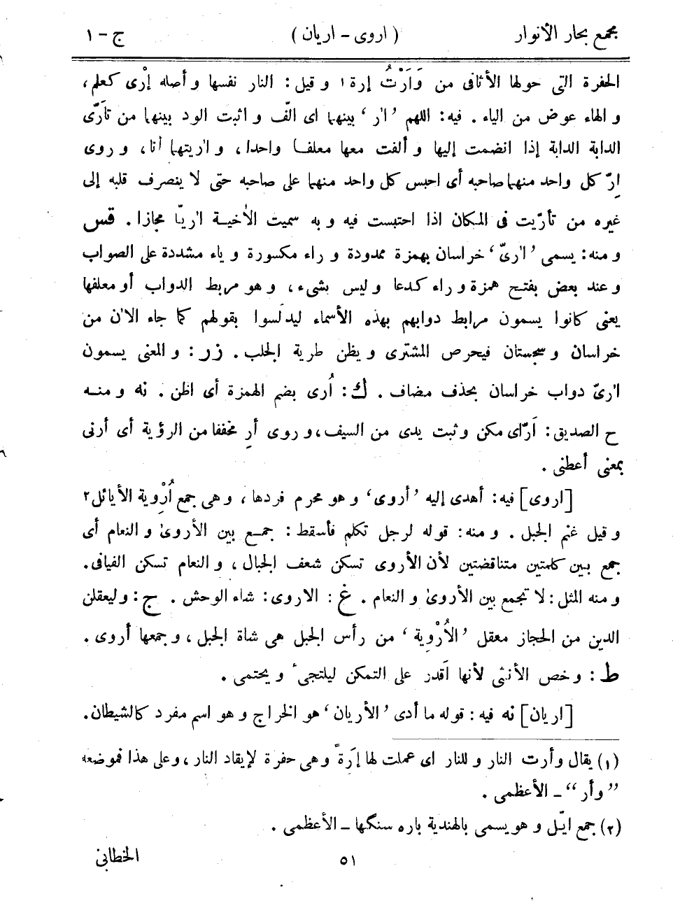 الحفرة التي حولها الأثافي من وارات إرة وقيل: النار نفسها وأصله إرى كعلم، والهاء عوض من الياء. فيه: اللهم "أر" بينهما أي ألف واثبت الود بينهما من تارى الدابة الدابة إذا انضمت إليها وألفت معها معلفاً واحداً، وأريتهما أنا، وروى أر كل واحد منهما صاحبه أي احبس كل واحد منهما على صاحبه حتى لا ينصرف قلبه إلى غيره من تأريت في المكان إذا احتبست فيه وبه سميت الأخية أرياً مجازاً. قس ومنه: يسمى "أرى" خراسان بهمزة ممدودة وراء مكسورة وياء مشددة على الصواب وعند بعض بفتح همزة وراء كدعا وليس بشيء، وهو مربط الدواب أو معلفها يعني كانوا يسمون مرابط دوابهم بهذه الأسماء ليدلسوا بقولهم كما جاء الآن من خراسان وسجستان فيحرص المشتري ويظن طرية الجلب. زر: والمعنى يسمون أرى دواب خراسان بحذف مضاف. ك: أري بضم الهمزة أي أظن. نه ومنه ح الصديق: أراي مكن وثبت يدي من السيف، وروى أر مخففاً من الرؤية أي أرني بمعنى أعطني.