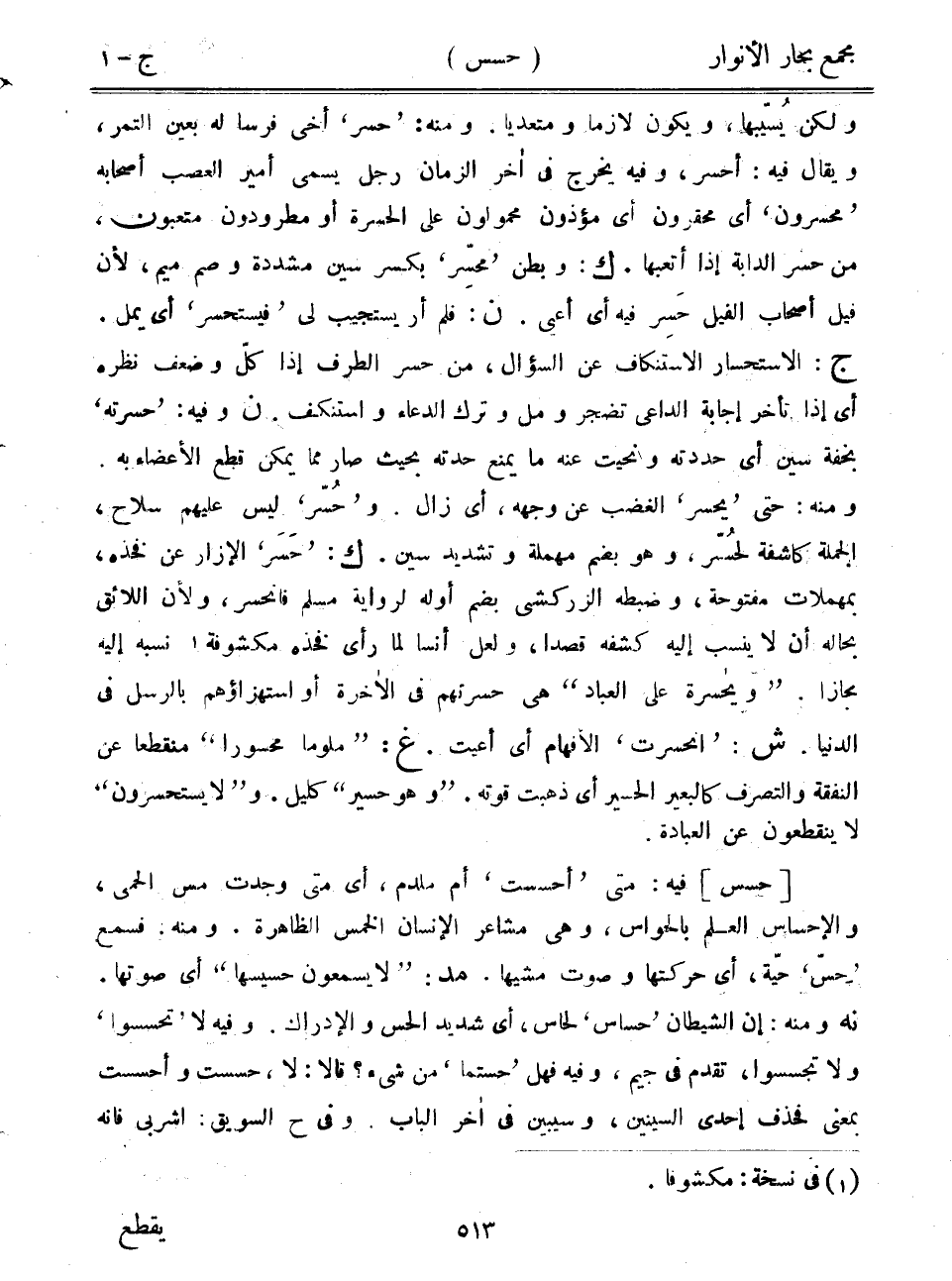 ولكن يسيبها، ويكون لازماً ومتعدياً. ومنه: "حسر" أخي فرساً له بعين التمر، ويقال فيه: أحسر، وفيه يخرج في آخر الزمان رجل يسمى أمير العصب أصحابه "محسرون" أي محقرون أي مؤذون محمولون على الحسرة أو مطرودون متعبون، من حسر الدابة إذا أتعبها. ك: وبطن "محسر" بكسر سين مشددة وصم ميم، لأن فيل أصحاب الفيل حسر فيه أي أعيي. ن: فلم أر يستجيب لي "فيستحسر" أي يمل. ج: الاستحسار الاستناكف عن السؤال، من حسر الطرف إذا كل وضعف نظره أي إذا تأخر إجابة الداعي تضجر ومل وترك الدعاء واستنكف. ن وفيه: "حسرته" بخفة سين أي حددته ونحيت عنه ما يمنع حدته بحيث صار مما يمكن قطع الأعضاء به. ومنه: حتى "يحسر" الغضب عن وجهه، أي زال. و"حسر" ليس عليهم سلاح، الجملة كاشفة لحسر، وهو بضم مهملة وتشديد سين. ك: "حسر" الإزار عن فخذه، بمهملات مفتوحة، وضبطه الزركشي بضم أوله لرواية مسلم فانحسر، ولأن اللائق بحاله أن لا ينسب إليه كشفه قصداً، ولعل أنساً لما رأى فخذه مكشوفة نسبه إليه مجازاً. "ويا حسرة على العباد" هي حسرتهم في الآخرة أو استهزاؤهم بالرسل في الدنيا. ش: "انحسرت" الأفهام أي أعيت. غ: "ملوماً محسوراً" منقطعاً عن النفقة والتصرف كالبعير الحسير أي ذهبت قوته. "وهو حسير" كليل. و"لا يستحسرون" لا ينقطعون عن العبادة.