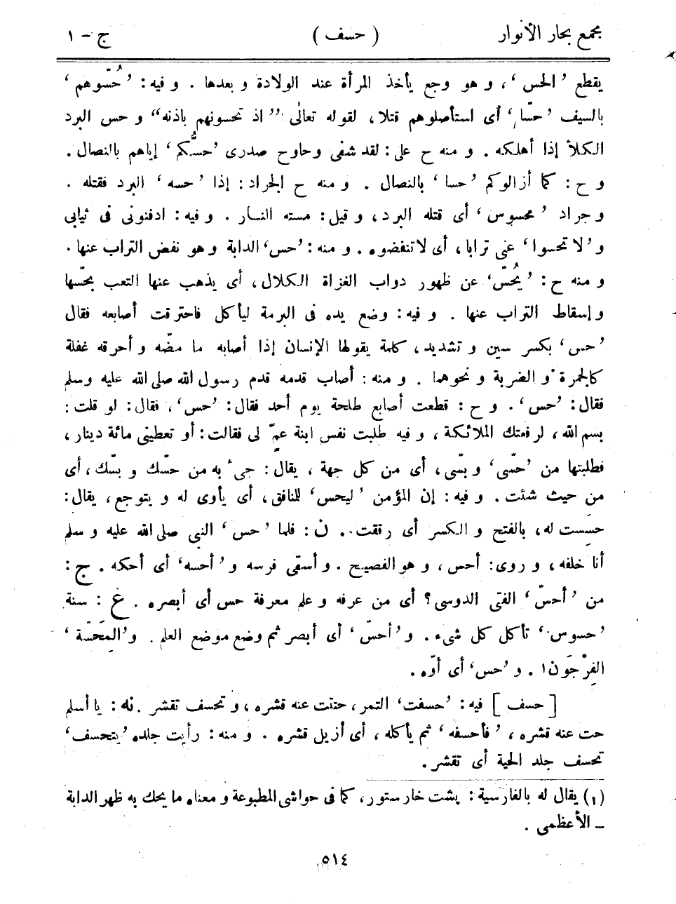 يقطع "الحس"، وهو وجع يأخذ المرأة عند الولادة وبعدها. وفيه: "حسوهم" بالسيف "حسا" أي استأصلوهم قتلاً، لقوله تعالى: {إذ تحسونهم بإذنه} وحس البرد الكلأ إذا أهلكه. ومنه ح على: لقد شفى وحاوح صدري "حسبكم" إياهم بالنصال. وح: كما أزالوكم "حسا" بالنصال. ومنه ح الجراد: إذا "حسه" البرد فقتله. وجراد "محسوس" أي قتله البرد، وقيل: مسته النار. وفيه: ادفنوني في ثيابي و"لا تحسوا" عني تراباً، أي لا تنفضوه. ومنه: "حس" الدابة وهو نفض التراب عنها. ومنه ح: "يحس" عن ظهور دواب الغزاة الكلال، أي يذهب عنها التعب بحسها وإسقاط التراب عنها. وفيه: وضع يده في البرمة ليأكل فاحترقت أصابعه فقال "حس" بكسر سين وتشديد، كلمة يقولها الإنسان إذا أصابه ما مضه وأحرقه غفلة كالجمرة والضربة ونحوهما. ومنه: أصاب قدمه قدم رسول الله صلى الله عليه وسلم فقال: "حس". وح: قطعت أصابع طلحة يوم أحد فقال: "حس"، فقال: لو قلت: بسم الله، لرفعتك الملائكة، وفيه طلبت نفس ابنة عم لي فقالت: أو تعطيني مائة دينار، فطلبتها من "حسي" وبسي، أي من كل جهة، يقال: جيء به من حسك وبسك، أي من حيث شئت. وفيه: إن المؤمن "ليحس" للمنافق، أي يأوى له ويتوجع، يقال: حسست له، بالفتح والكسر أي رققت. ن: فلما "حس" النبي صلى الله عليه وسلم أنا خلفه، وروى: أحس، وهو الفصيح. وأسقى فرسه و"أحسه" أي أحكه. ج: من "أحس" الفتى الدوسي؟ أي من عرفه وعلم معرفة حس أي أبصره. غ: سنة "حسوس" تأكل كل شيء. و"أحس" أي أبصر ثم وضع موضع العلم. و"المحسة" الفرجون. و"حس" أي أوه.