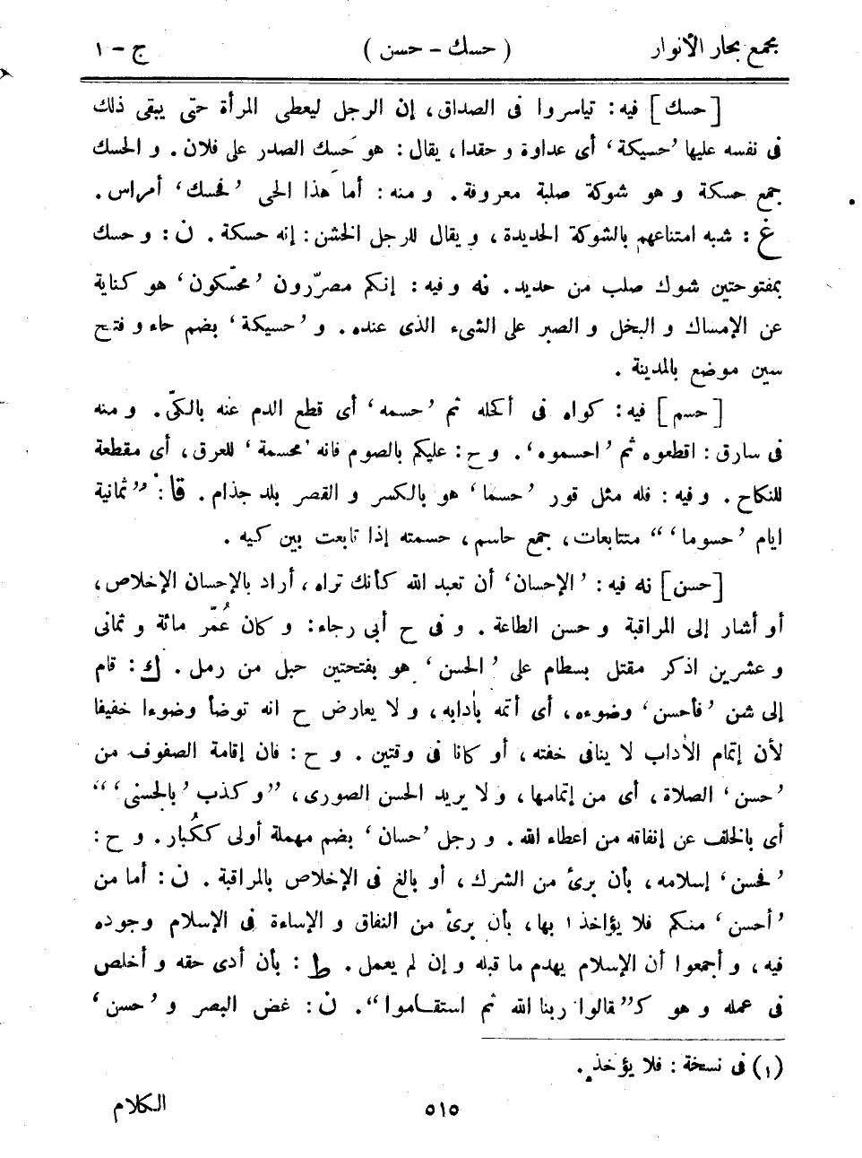 [حسن] نه فيه: "الإحسان" أن تعبد الله كأنك تراه، أراد بالإحسان الإخلاص، أو أشار إلى المراقبة وحسن الطاعة. وفي ح أبي رجاء: وكان عمر مائة وثماني وعشرين اذكر مقتل بسطام على "الحسن" هو بفتحتين حبل من رمل. ك: قام إلى شن "فأحسن" وضوءه، أي أتمه بآدابه، ولا يعارض ح أنه توضأ وضوءاً خفيفاً لأن إتمام الآداب لا ينافي خفته، أو كانا في وقتين. وح: فإن إقامة الصفوف من "حسن" الصلاة، أي من إتمامها، ولا يريد الحسن الصوري، "وكذب"بالحسنى"" أي بالخلف عن إنفاقه من إعطاء الله. ورجل "حسان" بضم مهملة أولى ككبار. وح: "فحسن" إسلامه، بأن برئ من الشرك، أو بالغ في الإخلاص بالمراقبة. ن: أما من "أحسن" منكم فلا يؤاخذ بها، بأن برئ من النفاق والإساءة في الإسلام وجوده فيه، وأجمعوا أن الإسلام يهدم ما قبله وإن لم يعمل. ط: بأن أدى حقه وأخلص في عمله وهو كـ"قالوا ربنا الله ثم استقاموا". ن: غض البصر و"حسن"