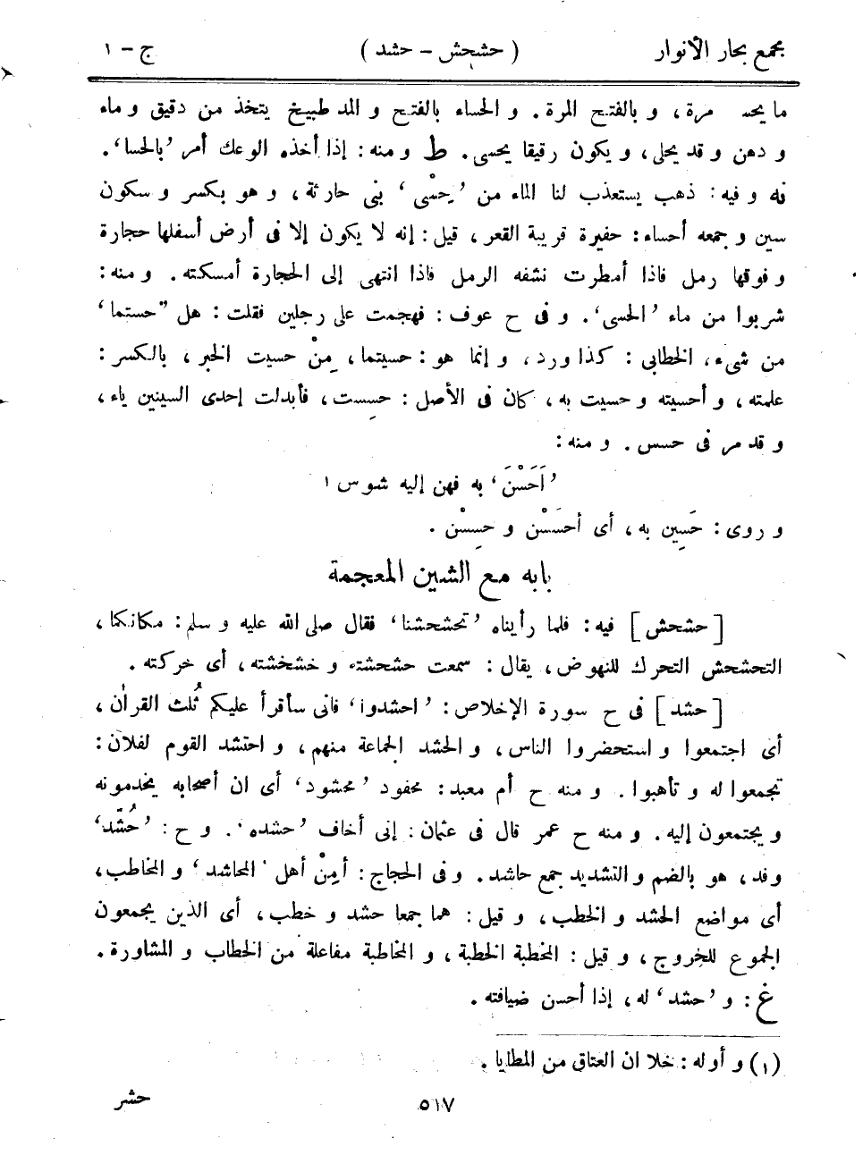 ما يحس مرة، وبالفتح المرة. والحساء بالفتح والمد طبيخ يتخذ من دقيق وماء ودهن وقد يحلى، ويكون رقيقاً يحسى. ط ومنه: إذا أخذه الوعك أمر "بالحسا". نه وفيه: ذهب يستعذب لنا الماء من "حسى" بني حارثة، وهو بكسر وسكون سين وجمعه أحساء: حفيرة قريبة القعر، قيل: إنه لا يكون إلا في أرض أسفلها حجارة وفوقها رمل فإذا أمطرت نشفه الرمل فإذا انتهى إلى الحجارة أمسكته. ومنه: شربوا من ماء "الحسى". وفي ح عوف: فهجمت على رجلين فقلت: هل "حستما" من شيء، الخطابي: كذا ورد، وإنما هو: حسيتما، من حسيت الخبر، بالكسر: علمته، وأحسيته وحسيت به، كان في الأصل: حسست، فأبدلت إحدى السينين ياء، وقد مر في حسس. ومنه: