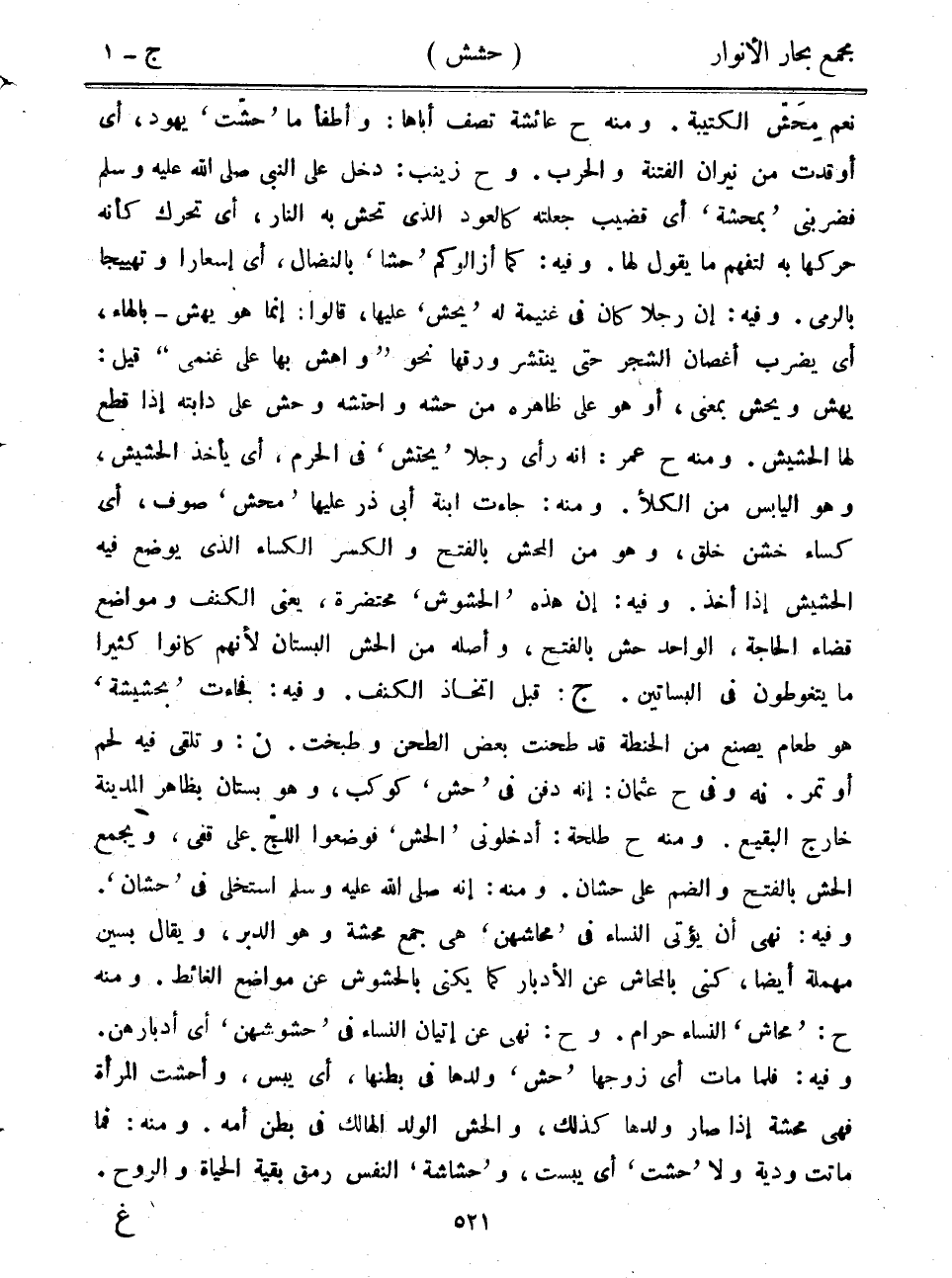 نعم محش الكتيبة. ومنه ح عائشة تصف أباها: وأطفأ ما "حشت" يهود، أي أوقدت من نيران الفتنة والحرب. وح زينب: دخل على النبي صلى الله عليه وسلم فضربني "بمحشة" أي قضيب جعلته كالعود الذي تحش به النار، أي تحرك كأنه حركها به لتفهم ما يقول لها. وفيه: كما أزالوكم "حشا" بالنضال، أي إسعاراً وتهييجاً بالرمي. وفيه: إن رجلاً كان في غنيمة له "يحش" عليها، قالوا: إنما هو يهش- بالهاء، أي يضرب أغصان الشجر حتى ينتشر ورقها نحو "واهش بها على غنمي" قيل: يهش ويحش بمعنى، أو هو على ظاهره من حشه واحتشه وحش على دابته إذا قطع لها الحشيش. ومنه ح عمر: أنه رأى رجلاً "يحتش" في الحرم، أي يأخذ الحشيش، وهو اليابس من الكلأ. ومنه: جاءت ابنة ابي ذر عليها "محش" صوف، أي كساء خشن خلق، وهو من المحش بالفتح والكسر الكساء الذي يوضع فيه الحشيش إذا أخذ. وفيه: إن هذه "الحشوش" محتضرة، يعني الكنف ومواضع قضاء الحاجة، الواحد حش بالفتح، وأصله من الحش البستان لأنهم كانوا كثيراً ما يتغوطون في البساتين. ج: قبل اتخاذ الكنف. وفيه: فجاءت "بحشيشة" هو طعام يصنع من الحنطة قد طحنت بعض الطحن وطبخت. ن: وتلقى فيه لحم أو تمر. نه وفي ح عثمان: إنه دفن في "حش" كوكب، وهو بستان بظاهر المدينة خارج البقيع. ومنه ح طلحة: أدخلوني "الحش" فوضعوا اللج على قفي، ويجمع الحش بالفتح والضم على حشان. ومنه: إنه صلى الله عليه وسمل استخلى في "حشان". وفيه: نهى أن يؤتى النساء في "محاشهن" هي جمع محشة وهو الدبر، ويقال بسين مهملة أيضاً، كني بالمحاش عن الأدبار كما يكني بالحشوش عن مواضع الغائط. ومنه ح: "محاش" النساء حرام. وح: نهى عن إتيان النساء في "حشوشهن" أي أدبارهن. وفيه: فلما مات أي زوجها "حش" ولدها في بطنها، أي يبس، وأحشت المرأة فهي محشة إذا صار ولدها كذلك، والحش الولد الهالك في بطن أمه. ومنه: فما ماتت ودية ولا "حشت" أي يبست، و"حشاشة" النفس رمق بقية الحياة والروح.