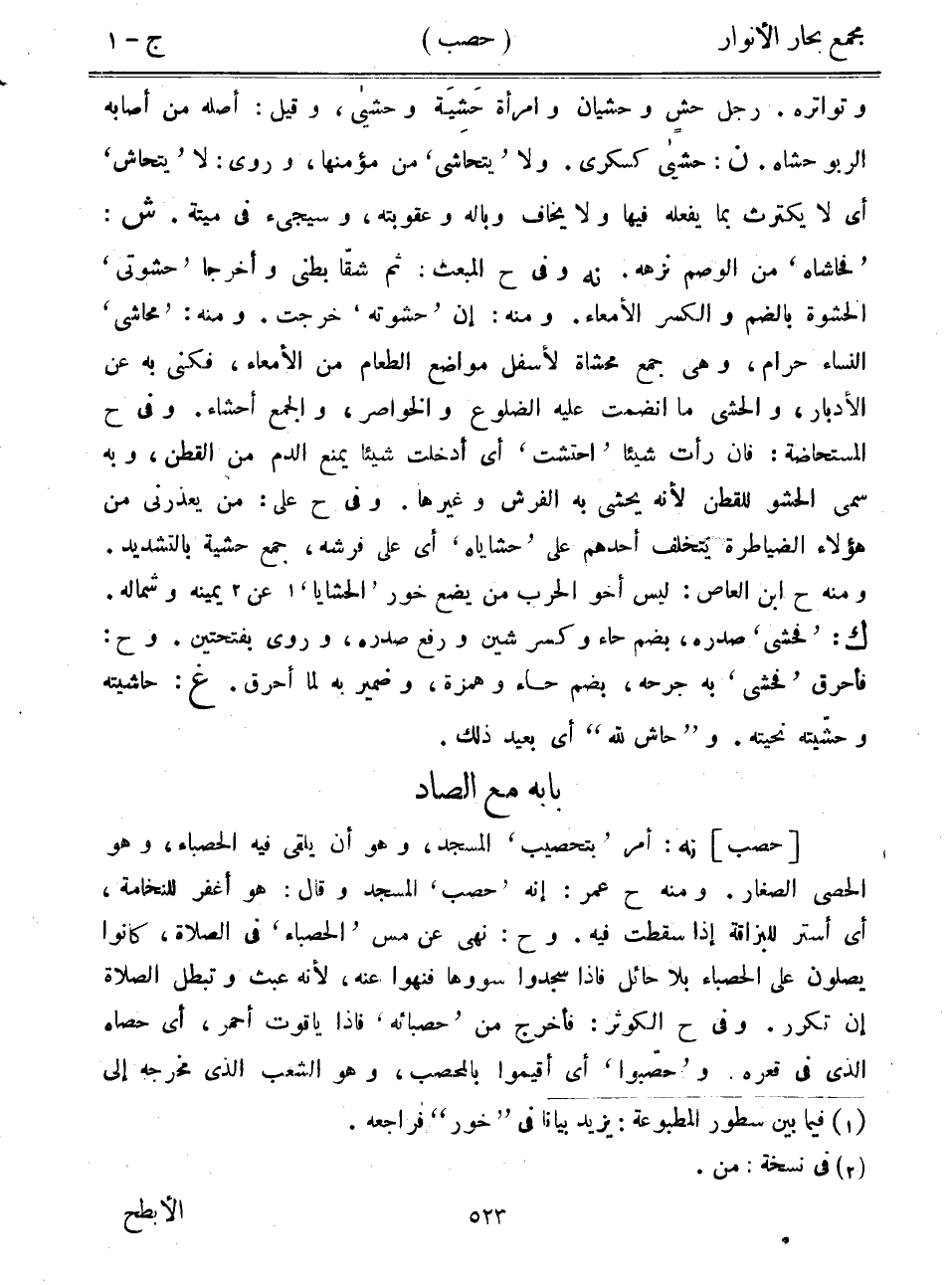 [حصب] نه: أمر "بتحصيب" المسجد، وهو أن يلقى فيه الحصباء، وهو الحصى الصغار. ومنه ح عمر: إنه "حصب" المسجد وقال: هو أغفر للنخامة، أي أستر للبزاقة إذا سقطت فيه. وح: نهى عن مس "الحصباء" في الصلاة، كانوا يصلون على الحصباء بلا حائل فإذا سجدوا سووها فنهوا عنه، لأنه عبث وتبطل الصلاة إن تكرر. وفي ح الكوثر: فأخرج من "حصبائه" فإذا ياقوت أحمر، أي حصاه الذي في قعره. و"حصبوا" أي أقيموا بالمحصب، وهو الشعب الذي مخرجه إلى