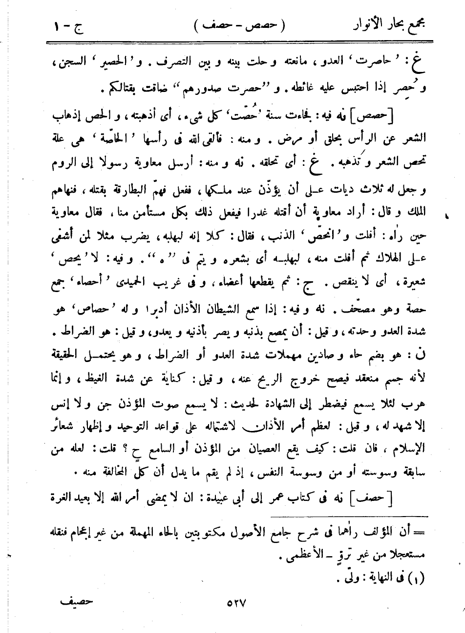 [حصص] نه فيه: فجاءت سنة "حصت" كل شيء، أي أذهبته، والحص إذهاب الشعر عن الرأس بحلق أو مرض. ومنه: فألقى الله في رأسها "الحاصة" هي علة تحص الشعر وتذهبه. غ: أي تحلقه. نه ومنه: أرسل معاوية رسولاً إلى الروم وجعل له ثلاث ديات على أن يؤذن عند ملكها، ففعل فهم البطارقة بقتله، فنهاهم الملك وقال: أراد معاوية أن أقتله غدراً فيفعل ذلك بكل مستأمن منا، فقال معاوية حين رآه: أفلت و"انحص" الذنب، فقال: كلا إنه لبهلبه، يضرب مثلاً لمن أشفى على الهلاك ثم أفلت منه، لبهلبه أي بشعره ويتم في "هـ". وفيه: لا "يحص" شعيرة، أي لا ينقص. ج: ثم يقطعها أعضاء، وفي غريب الحميدي "أحصاء" جمع حصة وهو مصحف. نه وفيه: إذا سمع الشيطان الأذان أدبر وله "حصاص" هو شدة العدو وحدته، وقيل: أن يمصع بذنبه ويصر بأذنيه ويعدو، وقيل: هو الضراط. ن: هو بضم حاء وصادين مهملات شدة العدو أو الضراط، وهو يحتمل الحقيقة لأنه جسم منعقد فيصح خروج الريح عنه، وقيل: كناية عن شدة الغيظ، وإنما هرب لئلا يسمع فيضطر إلى الشهادة لحديث: لا يسمع صوت المؤذن جن ولا إنس إلا شهد له، وقيل: لعظم أمر الأذان لاشتماله على قواعد التوحيد وإظهار شعائر الإسلام، فإن قلت: كيف يقع العصيان من المؤذن أو السامع ح؟ قلت: لعله من سابقة وسوسته أو من وسوسة النفس، إذ لم يقم ما يدل أن كل المخالفة منه.