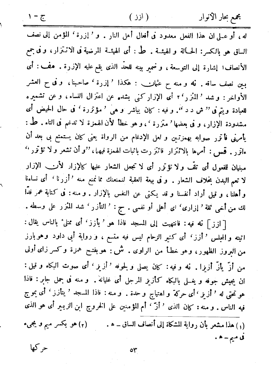 له، أو على أن هذا الفعل معدود في أفعال أهل النار. و"إزرة" المؤمن إلى نصف الساق هو بالكسر: الحالة والهيئة. ط: أي الهيئة المرضية في الائتزار، وفي جمع الأنصاف إشارة على التوسعة، وضمير بينه للحد الذي يقع عليه الإزرة. مف: أي بين نصف ساقه. نه ومنه ح عثمان: هكذا "إزرة" صاحبنا، وفي ح العشر الأواخر: وشد "المئزر" أي الإزار كنى بشده عن اعتزال النساء، وعن تشميره للعبادة ويتم في "ش د د". وفيه: كان يباشر وهي "مؤتزرة" في حال الحيض أي مشدودة الإزار، وفي بعضها "متزرة"، وهو خطأ لأن الهمزة لا تدغم في التاء. ط: يأمرني فأتزر صوابه بهمزتين ولعل الإدغام من الرواة يعني كان يستمتع بي بعد أن ءاتزر. قس: أمرها بالائتزار فائتزرت بإثبات الهمزة فيهما، "وأن تشعر ولا تؤتزر" مبنيان للمفعول أي تلف ولا تؤتزر أي لا تجعل الشعار عليها كالإزار لأن الإزار لا تعم البدن بخلاف الشعار. وفي بيعة العقبة لنمنعنك مما نمنع منه "أزرنا" أي نساءنا وأهلنا، وقيل أراد أنفسنا وقد يكنى عن النفس بالإزار. ومنه: في كتابة عمر فداً لك من أخي ثقة "إزاري" أي أهلي أو نفسي. ج: "التأزر" شد المئزر على وسطه.