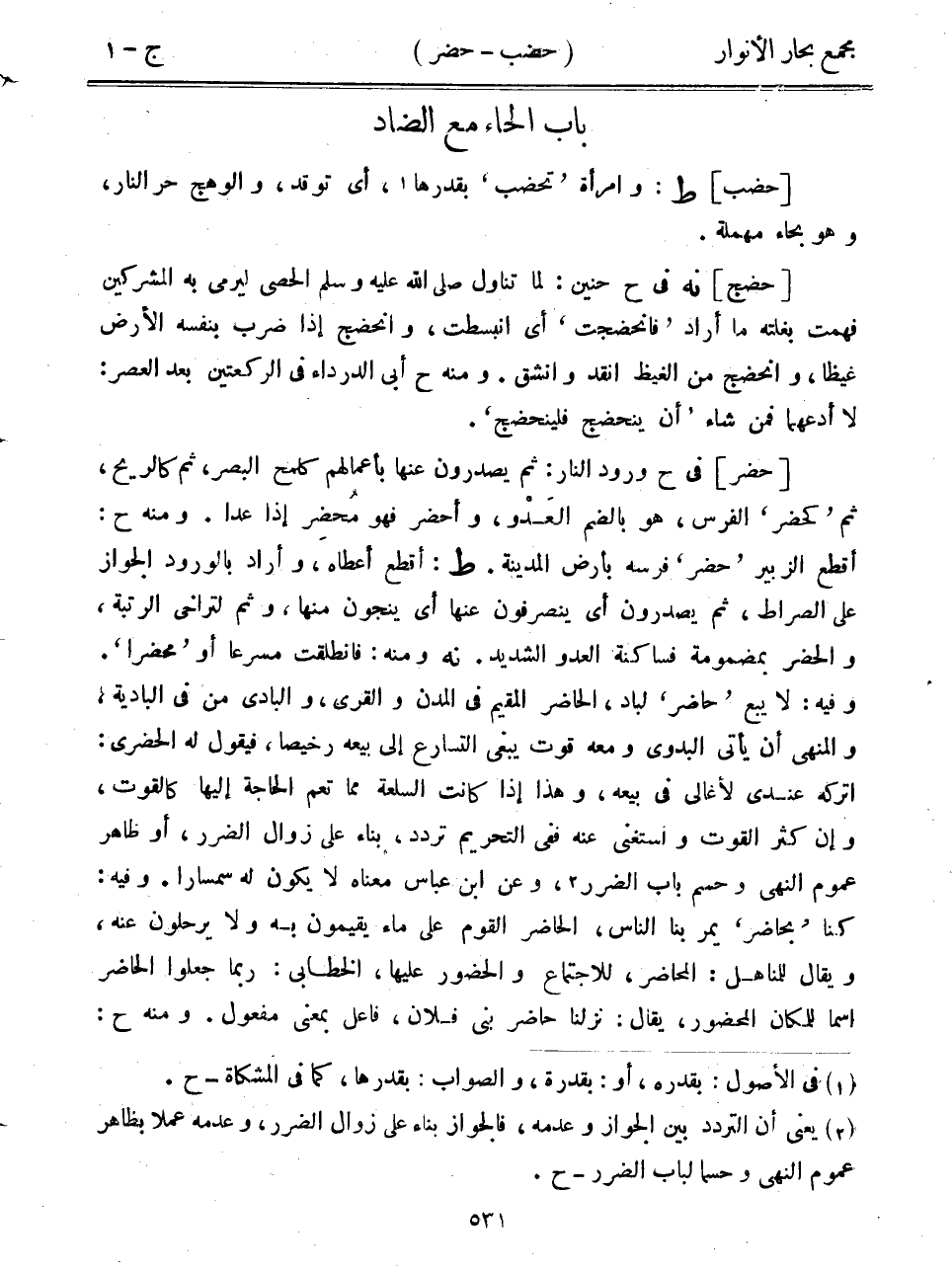 [حضر] في ح ورود النار: ثم يصدرون عنها بأعمالهم كلمح البصر، ثم كالريح، ثم "كحضر" الفرس، هو بالضم العدو، وأحضر فهو محضر إذا عدا. ومنه ح: أقطع الزبير "حضر" فرسه بأرض المدينة. ط: أقطع أعطاه، وأراد بالورود الجواز على الصراط، ثم يصدرون أي ينصرفون عنها أي ينجون منها، وثم لتراخى الرتبة، والحضر بمضمومة فساكنة العدو الشديد. نه ومنه: فانطلقت مسرعاً أو "محضراً". وفيه: لا يبع "حاضر" لباد، الحاضر المقيم في المدن والقرى، والبادي من في البادية، والمنهي أن يأتي البدوي ومعه قوت يبغي التسارع إلى بيعه رخيصاً، فيقول له الحضري: اتركه عند لأغالي في بيعه، وهذا إذا كانت السلعة مما تعم الحاجة إليها كالقوت، وإن كثر القوت واستغنى عنه ففي التحريم تردد، بناءً على زوال الضرر، أو ظاهر عموم النهي وحسم باب الضرر، وعن ابن عباس معناه لا يكون له سمساراً. وفيه: كنا "بحاضر" يمر بنا الناس، الحاضر القوم على ماء يقيمون به ولا يرحلون عنه، ويقال للمناهل: المحاضر، للاجتماع والحضور عليها، الخطابي: ربما جعلوا الحاضر اسماً للمكان المحضور، يقال: نزلنا حاضر بني فلان، فاعل بمعنى مفعول. ومنه ح: