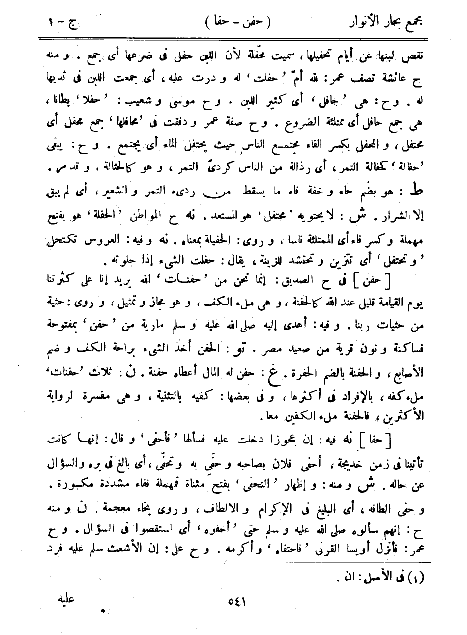 نقص لبنها عن أيام تحفيلها، سميت محفلة لأن اللبن حفل في ضرعها أي جمع. ومنه ح عائشة تصف عمر: لله أم "حفلت" له ودرت عليه، أي جمعت اللبن في ثديها له. وح: هي "حافل" أي كثير اللبن. وح موسى وشعيب: "حفلاً" بطاناً، هي جمع حافل أي ممتلئة الضروع. وح صفة عمر ودفقت في "محافلها" جمع محفل أي محتفل، والمحفل بكسر الفاء مجتمع الناس حيث يحتفل الماء أي يجتمع. وح: يبقى "حفالة" كحفالة التمر، أي رذالة من الناس كردي التمر، وهو كالحثالة، وقد مر. ط: هو بضم حاء وخفة فاء ما يسقط من رديء التمر والشعير، أي لم يبق إلا الشرار. ش: لا يحتويه "محتفل" هو المستعد. نه ح المواطن "الحفلة" هو بفتح مهملة وكسر فاء أي الممتلئة ناسا، وروى: الحفيلة بمعناه. نه وفيه: العروس تكتحل "وتحتفل" أي تتزين وتحتشد للزينة، يقال: حفلت الشيء إذا جلوته.