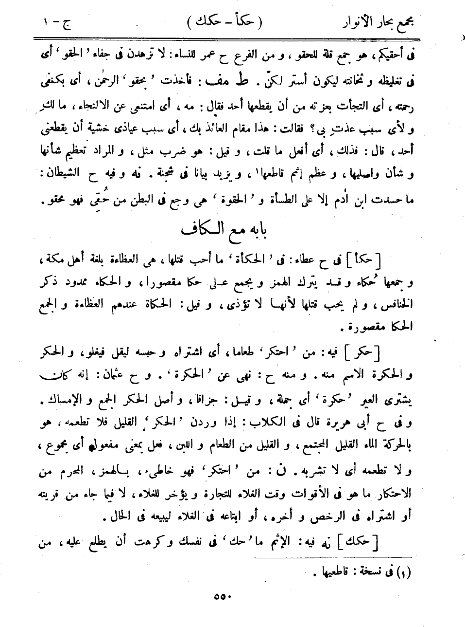 [حكر] فيه: من "احتكر" طعاماً، أي اشتراه وحبسه ليقل فيغلو، والحكر والحكرة الاسم منه. ومنه ح: نهى عن "الحكرة". وح عثمان: إنه كان يشتري العير "حكرة" أي جملة، وقيل: جزافاً، وأصل الحكر الجمع والإمساك. وفي ح أبي هريرة قال في الكلاب: إذا وردن "الحكر" القليل فلا تطعمه، هو بالحركة الماء القليل المجتمع، والقليل من الطعام واللبن، فعل بمعنى مفعول أي مجموع، ولا تطعمه أي لا تشربه. ن: من "احتكر" فهو خاطئ، بالهمز، المحرم من الاحتكار ما هو في الأقوات وقت الغلاء للتجارة ويؤخر للغلاء، لا فيما جاء من قريته أو اشتراه في الرخص وأخره، أو ابتاعه في الغلاء ليبيعه في الحال.