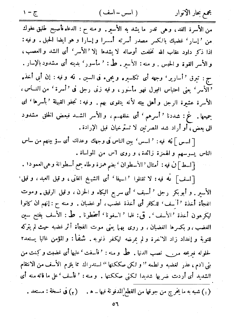 من الأسرة القد، وهي قدر ما يشد به الأسير. ومنه ح: الدعاء فأصبح طليق عفوك من "إسار" غضبك بالكسر مصدر أسرته أسراً وإساراً وهو أيضاً الحبل. وفيه: إذا ذكر داود عقاب الله تخلعت أوصاله لا يشدها إلا "الأسر" أي الشد والعصب، والأسر القوة والحبس. ومنه: الأسير. ط: "مأسور" بدينه أي مشدود بالإسار. ج: تبرق "أسارير" وجهه أي تكاسيره ويجيء في السين. نه وفيه: إن أبى أخذه "الأسر" يعني احتباس البول فهو مأسور، وفيه زنى رجل في "أسرة" من الناس، الأسرة عشيرة الرجل وأهل بيته لأنه يتقوى بهم. وفيه: تجفو القبيلة "بأسرها" أي جميعها. غ: شددنا "أسرهم" أي خلقهم، والأسر الشد فبعض الخلق مشدود إلى بعض، أو أراد شد المصرتين لا تسترخيان قبل الإرادة.