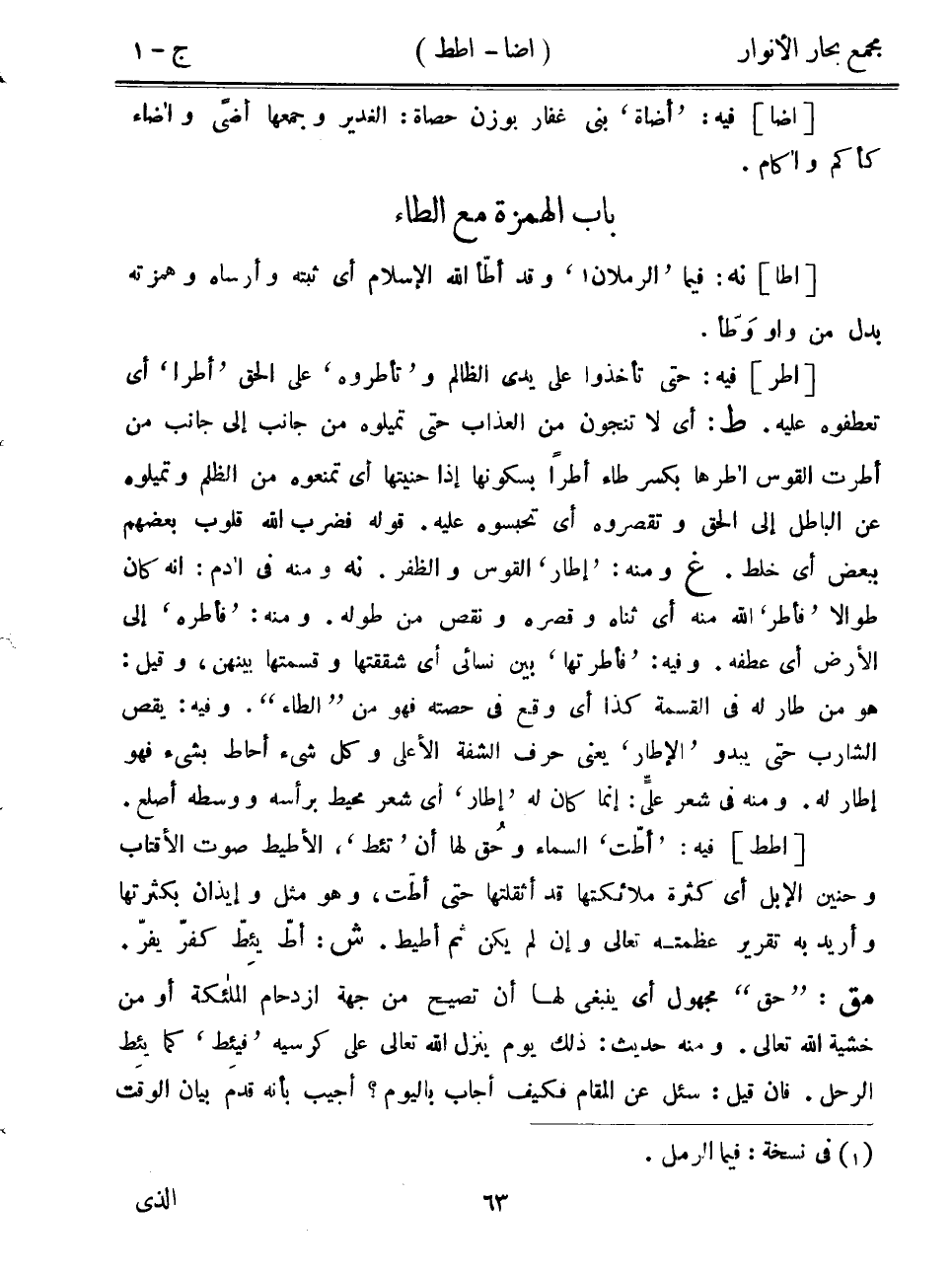 [اطر] فيه: حتى تأخذوا على يدي الظالم و"تأطروه" على الحق "أطرا" أي تعطفوه عليه. ط: أي لا تنجون من العذاب حتى تميلوه من جانب إلى جانب من أطرت القوس أطرها بكسر طاء أطراً بسكونها إذا حنيتها أي تمنعوه من الظلم وتميلوه عن الباطل إلى الحق وتقصروه أي تحبسوه عليه. قوله فضرب الله قلوب بعضهم ببعض أي خلط. غ ومنه: "إطار" القوس والظفر. نه ومنه في آدم: أنه كان طوالاً "فأطر" الله منه أي ثناه وقصره ونقص من طوله. ومنه: "فأطره" إلى الأرض أي عطفه. وفيه: "فأطرتها" بين نسائي أي شققتها وقسمتها بينهن، وقيل: هو من طار له في القسمة كذا أي وقع في حصته فهو من "الطاء". وفيه: يقص الشارب حتى يبدو "الإطار" يعني حرف الشفة الأعلى وكل شيء أحاط بشيء فهو إطار له. ومنه في شعر علي: إنما كان له "إطار" أي شعر محيط برأسه ووسطه أصلع.
