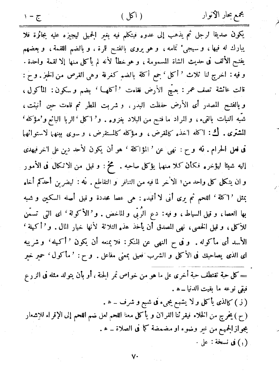يكون صديقاً لرجل ثم يذهب إلى عدوه فيتكلم فيه بغير الجميل ليجيزه عليه بجائزة فلا يبارك له فيها، وسيجيء تمامه، وهو يروى بالفتح للمرة، وبالضم اللقمة، وبعضهم يفتح الألف في حديث الشاة المسمومة، وهو خطأ لأنه لم يأكل منها إلا لقمة واحدة. وفيه: أخرج لنا ثلاث "أكل" جمع أكلة بالضم كغرفة وهي القرص من الخبز. وح: قالت عائشة تصف عمر: بعج الأرض فقاءت "أكلها" بضم وسكون: المأمول، وبالفتح المصدر أي الأرض حفظت البدر، وشربت المطر ثم قاءت حين أنبتت، شبه النبات بالقيء، والمراد ما فتح من البلاد بغزوه. و"أكل" الربا البائع و"مؤكله" المشتري. ك: أكله أخذه كالمقرضن ومؤكله كالمستقرض، وسوى بينهما لاستوائهما في فعل الحرام. نه وح: نهى عن "المؤاكلة" هو أن يكون لأحد دين على آخر فيهدي إليه شيئاً ليؤخره فكأن كلاً منهما يؤكل صاحبه. مخ: وقيل من الاتكال في الأمور وأن يتكل كل واحد من الآخر لما فيه من التنافر والتقاطع. نه: ليضربن أحدكم أخاه بمثل "أكلة" اللحم ثم يرى أني لا أقيده: هي عصا محددة وقيل أصله السكين وشبه بها العصا، وقيل السياط، وفيه: دع الربي والماخض. و"الأكولة" أي التي تسمن للأكل، وقيل الخصي، نهى المصدق أن يأخذ هذه الثلاثة لأنها خيار المال. و"أكيلة" الأسد أي مأكوله. وفي ح النهي عن المنكر: فلا يمنعه أن يكون "أكيله" وشريبه أي الذي يصاحبك في الأكل والشرب فعيل بمعنى مفاعل. وح: "مأكول" حمير خير