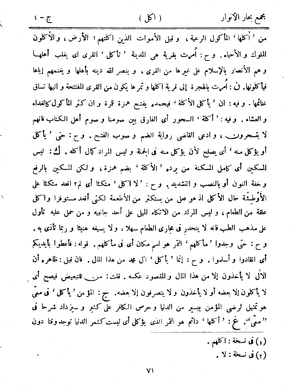 من "أكلها" المأكول الرعية، وقيل الأموات الذين أكلتهم الأرض، والأكلون الملوك والأحياء. وح: أمرت بقرية هي المدينة "تأكل" القرى أي يغلب أهلها وهم الأنصار بالإسلام على غيرها من القرى، وينصر الله دينه بأهلها ويغنمهم إياها فيأكلونها. ن: أمرت بالهجرة إلى قرية أكلها وثمرها يكون من القرى المفتتحة وإليها تساق غنائمها. وفيه: أن "يأكل الأكلة" فيحمده بفتح همزة للمرة وإن كثر المأكول كالغداء والعشاء. وفيه: "أكلة" السحور أي الفارق بين صومنا وصوم أهل الكتاب فإنهم لا يتسحرون، وادعى القاضي رواية الضم وصوب الفتح. وح: حتى "يأكل أو يؤكل منه" أي يصلح لأن يؤكل منه في الجملة وليس المراد كمال أكله. ك: ليس المسكين أي كامل المسكنة من يرده "الأكلة" بضم همزة، ولكن المسكين بالرفع وخفة النون أو بالنصب والتشديد. وح: "لا أكل" متكئاً على الأوطئة حال الأكل إذ هو فعل من يستكثر من الأطعمة لكني أقعد مستوفزاً وأكل علقة من الطعام، وليس المراد من الاتكاء الميل على أحد جانبيه ومن حمل عليه تأول على مذهب الطب فإنه لا ينحدر في مجاري الطعام سهلاً، ولا يسيغه هنيئاً وربما تأذى به. وح: حتى وجدوا "مأكلهم" التمر هو اسم مكان أي في مأكلهم. قوله: فأعطوا بأيديكم أي انقادوا وأسلموا. وح: إنما "يأكل" آل محمد من هذا المال. فإن قيل: ظاهره أن الآل لا يأخذون إلا من هذا المال والمقصود عكسه. قلت: من للتبعيض فيصح أي لا يأكلون إلا بعضه أو لا يأخذون ولا يتصرفون إلا بعضه. ج: المؤمن "يأكل" في معى هو تمثيل لرضى المؤمن بيسير من الدنيا وحرص الكافر على كثير وسيزداد شرحاً في "معى". غ: "أكلها" دائم هو الثمر الذي يؤكل أي ليست كثمر الدنيا توجد وقتاً دون