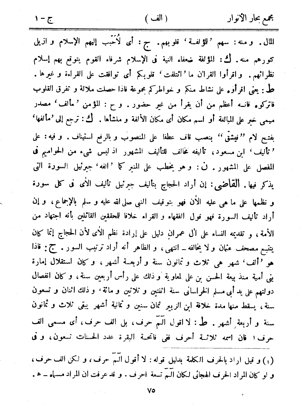 المال. ومنه: سهم "للمؤلفة" قلوبهم. ج: أي لا حبب إليهم الإسلام وأزيل تثورهم منه. ك: المؤلفة ضعفاء النية في الإسلام شرفاء القوم يتوقع بهم إسلام نظرائهم. واقرأوا القرآن ما "ائتلفت" قلوبكم أي توافقت على القراءة وغيرها. ط: يعني اقرأوه على نشاط منكم وخواطركم مجموعة فإذا حصلت ملالة وتفرق القلوب فاتركوه فإنه أعظم من أن يقرأ من غير حضور. وح: المؤمن "مألف" مصدر ميمي خبر على المبالغة أو اسم مكان أي مكان الألفة ومنشأها. ك: ترجع إلى "مألفها" بفتح لام "فيشق" بنصب قاف عطفاً على المنصوب وبالرفع استيناف. وفيه: على "تأليف" ابن مسعود، تأليفه مخالف للتأليف المشهور إذ ليس شيء من الحواميم في المفصل على المشهور. ن: وهو يخطب على المنبر كما "ألفه" جبرئيل السورة التي يذكر فيها. القاضي: إن أراد الحجاج بتأليف جبرئيل تأليف الأي في كل سورة ونظمها على ما هي عليه الآن فهو بتوقيف النبي صلى الله عليه وسلم بالإجماع، وإن أراد تأليفا لسورة فهو قول الفقهاء والقراء خلافاً للمحققين القائلين بأنه اجتهاد من الأمة، وتقديمه النساء على آل عمران دليل على إرادة نظم الأي لأن الحجاج إنما كان يتتبع مصحف عثمان ولا يخالفه- انتهى، والظاهر أنه أراد ترتيب السور. ج: فإذا هو "ألف" شهر هي ثلاث وثمانون سنة وأربعة أشهر، وكان استقلال إمارة بني أمية بيعة الحسن بن علي لمعاوية وذلك على رأس أربعين سنة، وكان انفصال دولتهم على يد أبي مسلم الخراساني سنة اثنتين وثلاثين ومائة، وذلك اثنان وتسعون سنة، يسقط منها مدة خلافة ابن الزبير ثمان سنين وثمانية أشهر يبقى ثلاث وثمانون سنة وأربعة أشهر. ط: لا أقول الم حرف، بل ألف حرف، أي مسمى ألف حرف فإن اسمه ثلاثة أحرف ففي فاتحة البقرة عدد الحسنات تسعون، وفي
