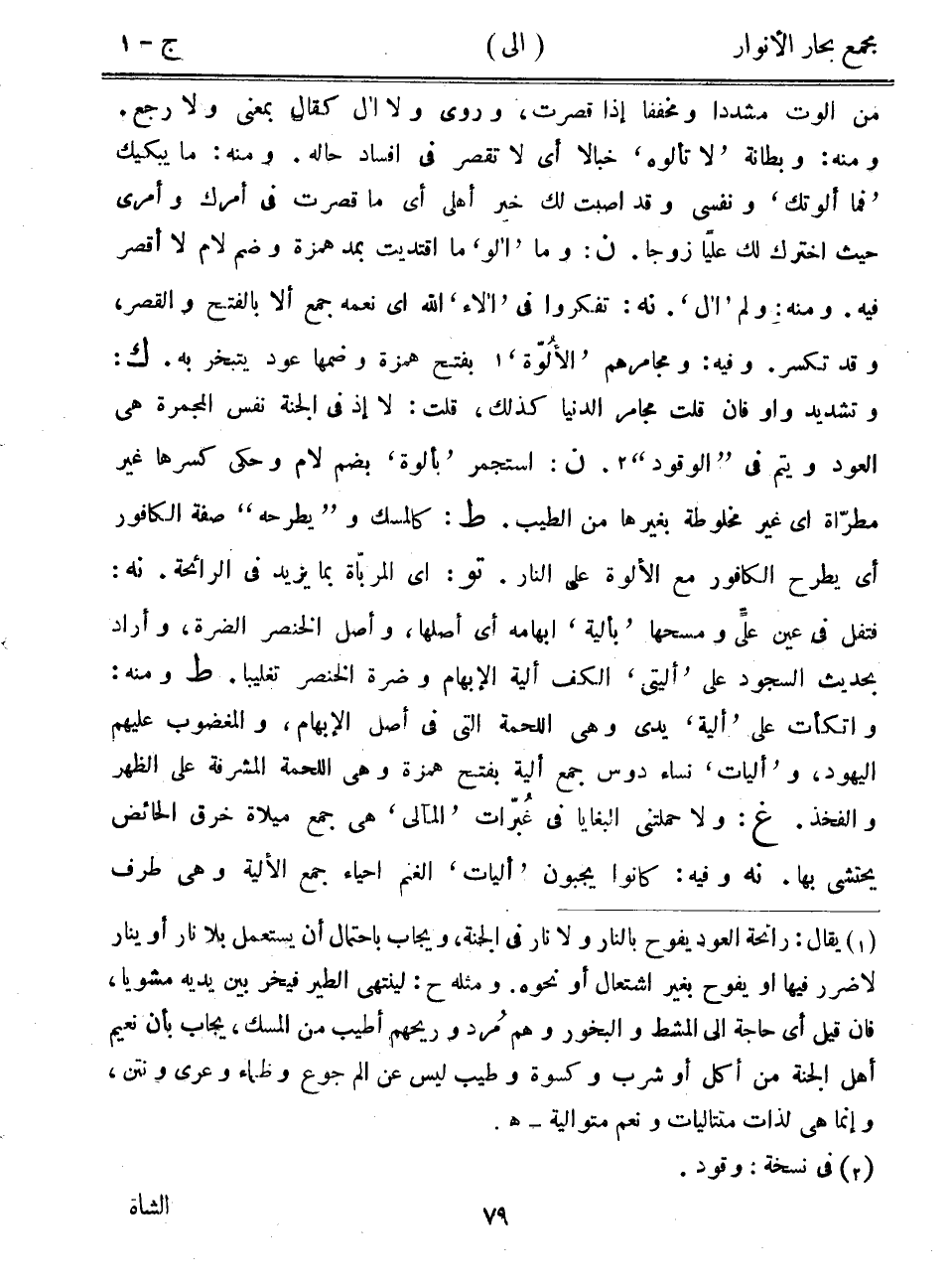 من ألوت مشدداً ومخففاً إذا قصرت، وروى ولا أل كقال بمعنى ولا رجع. ومنه: وبطانة "لا تألوه" خبالاً أي لا تقصر في إفساد حاله. ومنه: ما يبكيك "فما ألوتك" ونفسي وقد أصبت لك خير أهلي أي ما قصرت في أمرك وأمري حيث اخترك لك علياً زوجا. ن: وما "ألو" ما اقتديت بمد همزة وضم لام لا أقصر فيه. ومنه: ولم "أل". نه: تفكروا في "ألاء" الله أي نعمه جمع ألا بالفتح والقصر، وقد تكسر. وفيه: ومجامرهم "الألوة" بفتح همزة وضمها عود يتبخر به. ك: وتشديد واو فإن قلت مجامر الدنيا كذلك، قلت: لا إذ في الجنة نفس المجمرة هي العود ويتم في "الوقود". ن: استجمر "بألوة" بضم لام وحكى كسرها غير مطراة أي غير مخلوطة بغيرها من الطيب. ط: كالمسك و"يطرحه" صفة الكافور أي يطرح الكافور مع الألوة على النار. تو: أي المرباة بما يزيد في الرائحة. نه: فتفل في عين علي ومسحها "بألية" إبهامه أي أصلها، وأصل الخنصر الضرة، وأراد بحديث السجود على "أليتي" الكف ألية الإبهام وضرة الخنصر تغليباً. ط ومنه: واتكأت على "ألية" يدي وهي اللحمة التي في أصل الإبهام، والمغضوب عليهم اليهود، و"أليات" نساء دوس جمع ألية بفتح همزة وهي اللحمة المشرفة على الظهر والفخذ. غ: ولا حملتني البغايا في غبرات "المآلي" هي جمع ميلاة خرق الحائض يحتشى بها. نه وفيه: كانوا يجبون "أليات" الغنم إحياء جمع الألية وهي طرف