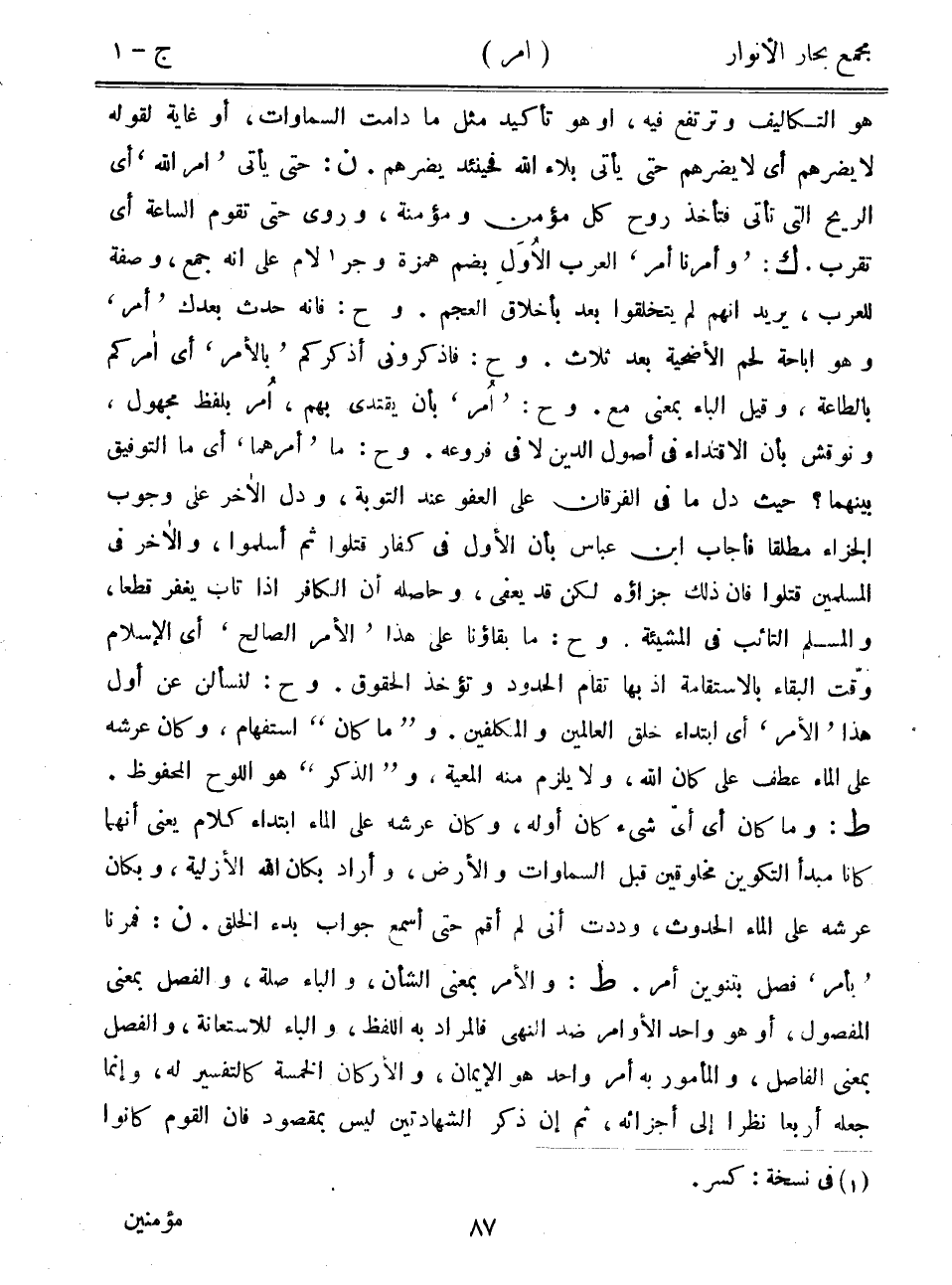 هو التكاليف وترتفع فيه، أو هو تأكيد مثل ما دامت السماوات، أو غاية لقوله لا يضرهم أي لا يضرهم حتى يأتي بلاء الله فحينئذ يضرهم. ن: حتى يأتي "أمر الله" أي الريح التي تأتي فتأخذ روح كل مؤمن ومؤمنة، وروى حتى تقوم الساعة أي تقرب. ك: "وأمرنا أمر" العرب الأول بضم همزة وجر لام على أنه جمع، وصفة للعرب، يريد أنهم لم يتخلقوا بعد بأخلاق العجم. وح: فإنه حدث بعدك "أمر" وهو إباحة لحم الأضحية بعد ثلاث. وح: فاذكروني أذكركم "بالأمر" أي أمركم بالطاعة، وقيل الباء بمعنى مع. وح: "أمر" بأن يقتدي بهم، أمر بلفظ مجهول، ونوقش بأن الإقتداء في أصول الدين لا في فروعه. وح: ما "أمرهما" أي ما التوفيق بينهما؟ حيث دل ما في الفرقان على العفو عند التوبة، ودل الآخر على وجوب الجزاء مطلقاً فأجاب ابن عباس بأن الأول في كفار قتلوا ثم أسلموا، والآخر في المسلمين قتلوا فإن ذلك جزاؤه لكن قد يعفى، وحاصله أن الكافر إذا تاب يغفر قطعاً، والمسلم التائب في المشيئة. وح: ما بقاؤنا على هذا "الأمر الصالح" أي الإسلام وقت البقاء بالاستقامة إذ بها تقام الحدود وتؤخذ الحقوق. وح: لنسألن عن أول هذا "الأمر" أي ابتداء خلق العالمين والمكلفين. و"ما كان" استفهام، وكان عرضه على الماء عطف على كان الله، ولا يلزم منه المعية، و"الذكر" هو اللوح المحفوظ. ط: وما كان أي أي شيء كان أوله، وكان عرشه على الماء ابتداء كلام يعني أنهما كانا مبدأ التكوين مخلوقين قبل السماوات والأرض، وأراد بكان الله الأزلية، وبكان عرشه على الماء الحدوث، وددت أني لم أقم حتى أسمع جواب بدء الخلق. ن: فمرنا "بأمر" فصل بتنوين أمر. ط: والأمر بمعنى الشأن، والباء صلة، والفصل بمعنى المفصول، أو هو واحد الأوامر ضد النهي فالمراد به اللفظ، والباء للاستعانة، والفصل بمعنى الفاصل، والمأمور به أمر واحد هو الإيمان، والأركان الخمسة كالتفسير له، وإنما جعله أربعاً نظراً إلى أجزائه، ثم إن ذكر الشهادتين ليس بمقصود فإن القوم كانوا