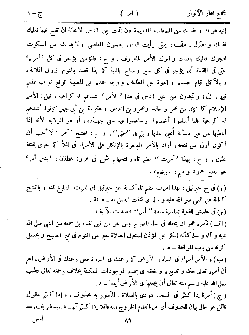 إليه هواك ونفسك من الصفات الذميمة فإن أقمت بين الناس لا محالة أن تقع فيها فعليك نفسك واعتزل. مف: يعني رأيت الناس يعملون المعاصي ولابد لك من السكوت لعجزك فعليك بنفسك وارتك الأمر بالمعروف. وح: فالمؤمن يؤجر في كل "أمره" حتى في اللقمة أي يؤجر في كل خير ومباح بالنية كما إذا قصد بالنوم زوال الملالة، وبالأكل قيام جسده والقوة على الطاعة، ووجه حمده على المصيبة توقع ثواب عظيم فيها. ن: وتجدون من خير الناس في هذا "الأمر" أشدهم له كراهية، قيل: الأمر الإسلام كما كان من عمر وخالد وعمرو بن العاص وعكرمة بن أبي جهل كانوا أشدهم له كراهية فلما أسلموا أخلصوا وجاهدوا فيه حق جهاده، أو هو الولاية لأنه إذا أعطيها من غير مسألة أعين عليها ويتم في "حتى". وح: افتتح "أمراً" لا أحب أن أكون أول من فتحه، أراد بالأمر المجاهرة بالإنكار على الأمراء في الملأ كما جرى لقتلة عثمان. وح: بهذا "أمرت" بضم تاء وفتحها. ش في غزوة غطفان: "بذي أمر" هو بفتح همزة وميم: موضع.