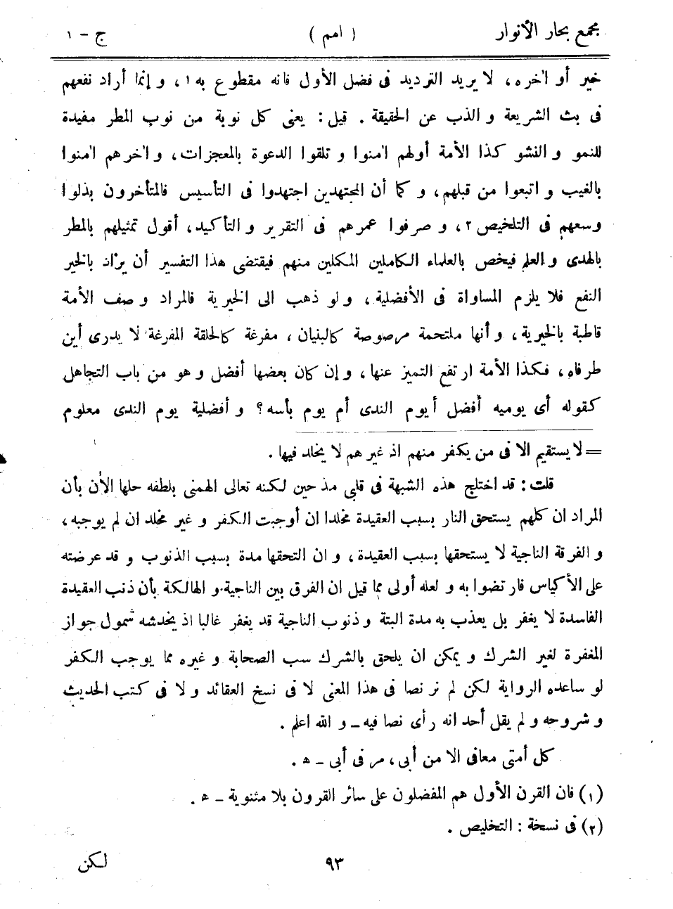خير أو آخره، لا يريد الترديد في فضل الأول فإنه مقطوع به، وإنما أراد نفعهم في بث الشريعة والذب عن الحقيقة. قيل: يعني كل نوبة من نوب المطر مفيدة للنمو والنشو كذا الأمة أولهم آمنوا وتلقوا الدعوة بالمعجزات، وآخرهم آمنوا بالغيب واتبعوا من قبلهم، وكما أن المجتهدين اجتهدوا في التأسيس فالمتأخرون بذلوا وسعهم في التلخيص، وصرفوا عمرهم في التقرير والتأكيد، أقول تمثيلهم بالمطر بالهدى والعلم فيخص بالعلماء الكاملين المكملين منهم فيقتضي هذا التفسير أن يزاد بالخير النفع فلا يلزم المساواة في الأفضلية، ولو ذهب إلى الخيرية فالمراد وصف الأمة قاطبة بالخيرية، وأنها ملتحمة مرصوصة كالبنيان، مفرغة كالحلقة المفرغة لا يدري أين طرفاه، فكذا الأمة ارتفع التميز عنها، وإن كان بعضها أفضل وهو من باب التجاهل كقوله أي يوميه أفضل أيوم الندى أم يوم بأسه؟ وأفضلية يوم الندى معلوم