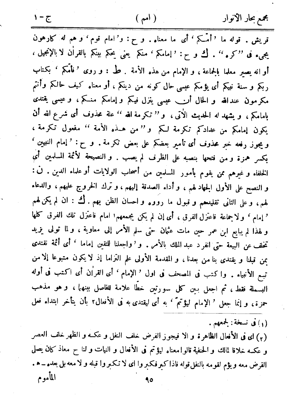 قريش. قوله ما "أمكم" أي ما معناه. وح: و"إمام قوم" وهم له كارهون يجيء في "كره". ك وح: "إمامكم" منكم يعني يحكم بينكم بالقرآن لا بالإنجيل، أو أنه يصير معلماً بالجماعة، والإمام من هذه الأمة. ط: وروى "فأمكم" بكتاب ربكم وسنة نبيكم أي يؤمكم عيسى حال كونه من دينكم، أو معناه كيف حالكم وأنتم مكرمون عند الله والحال أن عيسى ينزل فيكم وإمامكم منكم، وعيسى يقتدي بإمامكم، ويشهد له الحديث الآتي، و"تكرمة الله" علة محذوف أي شرع الله أن يكون إمامكم من عدادكم تكرمة لكم و"من هذه الأمة" مفعول تكرمة، ويجوز رفعه خبر محذوف أي تأمير بعضكم على بعض تكرمة. وح: "إمام النبيين" بكسر همزة ومن فتحها بنصبه على الظرف لم يصب. والنصيحة لأئمة المسلمين أي الخلفاء وغيرهم ممن يقوم بأمور المسلمين من أصحاب الولايات أو علماء الدين. ن: والنصح على الأول الجهاد لهم، وأداء الصدقة إليهم، وترك الخروج عليهم، والدعاء لهم، وعلى الثاني تقليدهم وقبول ما رووه وإحسان الظن بهم. ك: إن لم يكن لهم "إمام" ولا جماعة فاعتزل الفرق، أي إن لم يكن يجمعهم إمام فاعتزل تلك الفرق كلها ولهذا لم يبايع ابن عمر حين مات عثمان حتى سلم الأمر إلى معاوية، ولما تولى يزيد تخلف عن البيعة حتى انفرد عبد الملك بالأمر. و"واجعلنا للمتقين إماماً" أي أئمة نقتدي بمن قبلنا ويقتدي بنا من بعدنا، والمقدمة الأولى علم التزاماً إذ لا يكون متبوعاً إلا من تبع الأنبياء. واكتب في المصحف في أول "الإمام" أي القرآن أي اكتب في أوله البسملة فقط، ثم اجعل بين كل سورتين خطاً علامة للفاصل بينهما، وهو مذهب حمزة، وإنما جعل "الإمام ليؤتم، به أي ليقتدي به في الأفعال بأن يتأخر ابتداء فعل