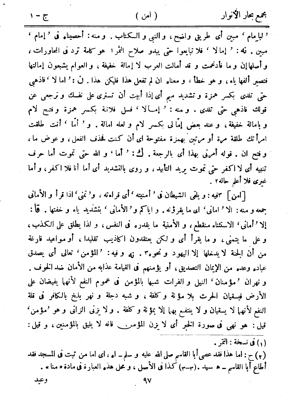 [امن] فيه: ويلقى الشيطان في "أمنيته" أي قراءته، و"تمنى" إذا قرأ والأماني جمعه ومنه: إلا "أماني" أي ما يقرؤنه. وإياكم و"الأماني" بتشديد ياء وخفتها. قا: إلا "أماني" الاستثناء منقطع، والأمنية ما يقدره في النفس، ولذا يطلق على الكذب، وعلى ما يتمنى، وما يقرأ أي ولكن يعتقدون أكاذيب تقليداً، أو مواعيد فارغة من أن الجنة لا يدخلها إلا اليهود ونحوه. نه وفيه: "المؤمن" تعالى أي يصدق عباده وعده من الإيمان التصديق، أو يؤمنهم في القيامة عذابه من الأمان ضد الخوف. ونهران "مؤمنان" النيل والفرات شبهاً بالمؤمن في عموم النفع لأنهما يفيضان على الأرض فيسقيان الحرث بلا مؤنة وكلفة، وشبه دجلة ونهر بلخ بالكافر في قلة النفع لأنهما لا يسقيان ولا ينتفع بهما إلا بمؤنة وكلفة. ولا يزني الزاني وهو "مؤمن" قيل: هو نهي في صورة الخبر أي لا يزن المؤمن فإنه لا يليق بالمؤمنين، وقيل: