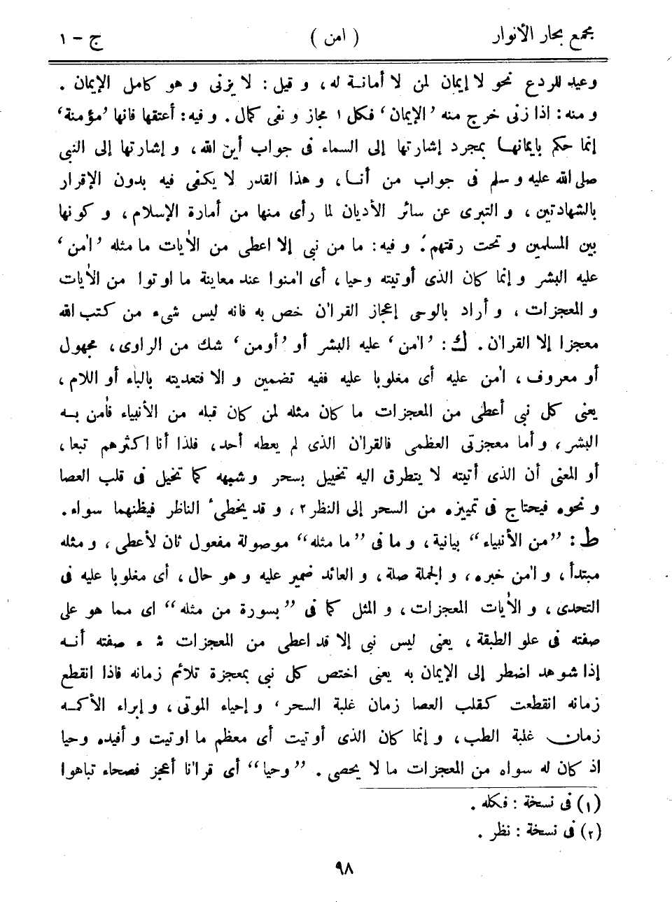 وعيد للردع نحو لا إيمان لمن لا أمانة له، وقيل: لا يزني وهو كامل الإيمان. ومنه: إذا زنى خرج منه "الإيمان" فكل مجاز ونفي كمال. وفيه: أعتقها فإنها "مؤمنة" إنما حكم بإيمانها بمجرد إشارتها إلى السماء في جواب أين الله، وإشارتها إلى النبي صلى الله عليه وسلم في جواب من أنا، وهذا القدر لا يكفي فيه بدون الإقرار بالشهادتين، والتبري عن سائر الأديان لما رأى منها من أمارة الإسلام، وكونها بين المسلمين وتحت رقتهم. وفيه: ما من نبي إلا أعطى من الآيات ما مثله "أمن" عليه البشر وإنما كان الذي أوتيته وحيا، أي أمنوا عند معاينة ما أوتوا من الآيات والمعجزات، وأراد بالوحي إعجاز القرآن خص به فإنه ليس شيء من كتب الله معجزاً إلا القرآن. ك: "أمن" عليه الشبر أو "أومن" شك من الراوي، مجهول أو معروف، أمن عليه أي مغلوباً عليه ففيه تضمين وإلا فتعديته بالباء أو اللام، يعني كل نبي أعطى من المعجزات ما كان مثله لمن كان قبله من الأنبياء فأمن به البشر، وأما معجزتي العظمى فالقرآن الذي لم يعطه أحد، فلذا أنا أكثرهم تبعاً، أو المعنى أن الذي أتيته لا يتطرق إليه تخييل بسحر وشبهه كما تخيل في قلب العصا ونحوه فيحتاج في تمييزه من السحر إلى النظر، وقد يخطئ الناظر فيظنهما سواء. ط: "من الأنبياء" بيانية، وما في "ما مثله" موصولة مفعول ثان لأعطى، ومثله مبتدأ، وأمن خبره، والجملة صلة، والعائد ضمير عليه وهو حال، أي مغلوباً عليه في التحدي، والآيات المعجزات، والمثل كما في "بسورة من مثله" أي مما هو على صفته في علو الطبقة، يعني ليس نبي إلا قد أعطى من المعجزات: شيء صفته أنه إذا شوهد اضطر إلى الإيمان به يعني اختص كل نبي بمعجزة تلائم زمانه فإذا انقطع زمانه انقطعت كقلب العصا زمان غلبة السحر، وإحياء الموتى، وإبراء الأكمه زمان غلبة الطب، وإنما كان الذي أوتيت أي معظم ما أوتيت وأفيده وحياً إذ كان له سواه من المعجزات ما لا يحصى. "وحيا" أي قرآناً أعجز فصحاء تباهوا