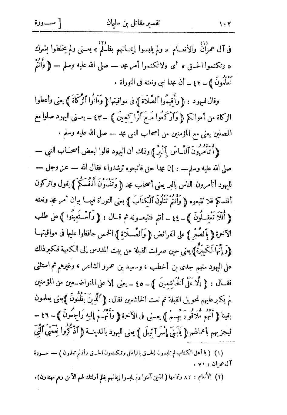 فِي آل عِمْرَانَ «1» والأنعام وَلَمْ يَلْبِسُوا إِيمانَهُمْ بِظُلْمٍ «2» يعني وَلَم يخلطوا بشرك وَتَكْتُمُوا الْحَقَّ أَي وَلا تكتموا أمر محمد- صَلَّى اللَّهُ عَلَيْهِ وَسَلَّمَ- وَأَنْتُمْ تَعْلَمُونَ- 42- أن محمدا نَبِيّ ونعته فى التوراة.
