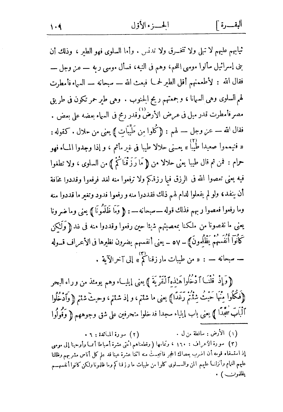 (3) سورة الأعراف: 160، وتمامها وَقَطَّعْناهُمُ اثْنَتَيْ عَشْرَةَ أَسْباطاً أُمَماً وَأَوْحَيْنا إِلى مُوسى إِذِ اسْتَسْقاهُ قَوْمُهُ أَنِ اضْرِبْ بِعَصاكَ الْحَجَرَ فَانْبَجَسَتْ مِنْهُ اثْنَتا عَشْرَةَ عَيْناً قَدْ عَلِمَ كُلُّ أُناسٍ مَشْرَبَهُمْ وَظَلَّلْنا عَلَيْهِمُ الْغَمامَ وَأَنْزَلْنا عَلَيْهِمُ الْمَنَّ وَالسَّلْوى كُلُوا مِنْ طَيِّباتِ مَا رَزَقْناكُمْ وَما ظَلَمُونا وَلكِنْ كانُوا أَنْفُسَهُمْ يَظْلِمُونَ.