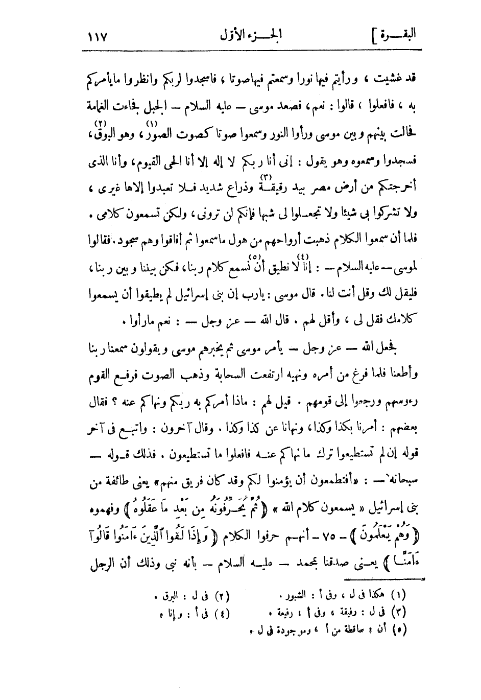 فجعل اللَّه- عَزَّ وَجَلّ- يأمر مُوسَى ثُمّ يخبرهم مُوسَى ويقولون سمعنا ربنا وأطعنا فَلَمَّا فرغ من أمره ونهيه ارتفعت السحابة وذهب الصوت فرفع القوم رءوسهم ورجعوا إلى قومهم. قِيلَ لهم: ماذا أمركم به ربكم ونهاكم عَنْهُ؟ فَقَالَ بعضهم: أمرنا بكذا وكذا، ونهانا عن كذا وكذا. وقَالَ آخرون: واتبع فِي آخر قوله إن لَمْ تستطيعوا ترك ما نهاكم عَنْهُ فافعلوا ما تستطيعون. فذلك قوله- سُبْحَانَهُ-: أَفَتَطْمَعُونَ أَنْ يُؤْمِنُوا لَكُمْ وَقَدْ كانَ فَرِيقٌ مِنْهُمْ يعني طائفة من بني إِسْرَائِيل يَسْمَعُونَ كَلامَ اللَّهِ ثُمَّ يُحَرِّفُونَهُ مِنْ بَعْدِ مَا عَقَلُوهُ وفهموه وَهُمْ يَعْلَمُونَ- 75- أنهم حرفوا الكلام وَإِذا لَقُوا الَّذِينَ آمَنُوا قالُوا آمَنَّا يعني صدقنا بمحمد- صَلَّى اللَّهُ عليه وسلم- بأنه نبى وذلك أن الرجل