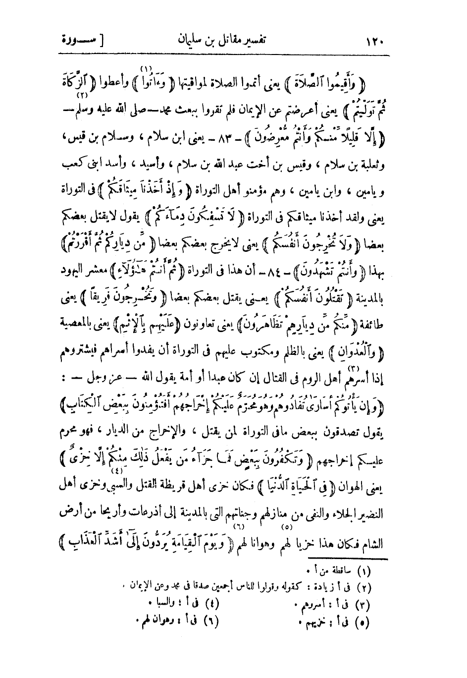 وَأَقِيمُوا الصَّلاةَ يعني أتموا الصَّلاة لمواقيتها وَآتُوا «1» وأعطوا الزَّكاةَ ثُمَّ تَوَلَّيْتُمْ يعني أعرضتم عن الْإِيمَان فلم تقروا ببعث محمد- صَلَّى اللَّهُ عَلَيْهِ وَسَلَّمَ «2» - إِلَّا قَلِيلًا مِنْكُمْ وَأَنْتُمْ مُعْرِضُونَ- 83- يعني ابْن سلام، وسلام بن قَيْس، وثعلبة بن سلام، وقيس بن أخت عَبْد اللَّه بن سلام، وأسيد، وأسد ابني كَعْب ويامين، وابن يامين، وهم مؤمنو أهل التوراة وَإِذْ أَخَذْنا مِيثاقَكُمْ فِي التوراة يعني ولقد أخذنا ميثاقكم فِي التوراة لا تَسْفِكُونَ دِماءَكُمْ يَقُولُ لا يقتل بعضكم بعضا وَلا تُخْرِجُونَ أَنْفُسَكُمْ يعني لا يُخْرُج بعضكم بعضا مِنْ دِيارِكُمْ ثُمَّ أَقْرَرْتُمْ بِهَذَا وَأَنْتُمْ تَشْهَدُونَ- 84- أن هَذَا فِي التوراة ثُمَّ أَنْتُمْ هؤُلاءِ مَعْشَر اليهود بالمدينة تَقْتُلُونَ أَنْفُسَكُمْ يعني يقتل بعضكم بعضا وَتُخْرِجُونَ فَرِيقاً يعني طائفة مِنْكُمْ مِنْ دِيارِهِمْ تَظاهَرُونَ يعني تعاونون عَلَيْهِمْ بِالْإِثْمِ يعني بالمعصية وَالْعُدْوانِ يعني بالظلم ومكتوب عليهم فِي التوراة أن يفدوا أسراهم فيشتروهم إذا أسرهم «3» أَهْل الروم فِي القتال إن كان عبدا أَوْ أَمَة يَقُولُ اللَّه- عَزَّ وَجَلّ-: