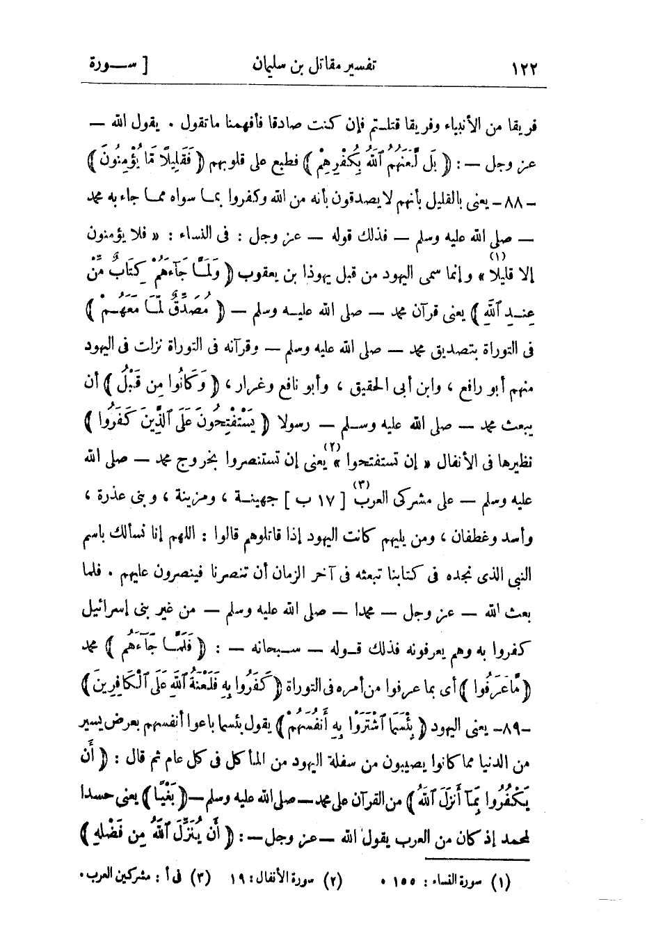 يَقُولُ اللَّه- عَزَّ وجل-: بَلْ لَعَنَهُمُ اللَّهُ بِكُفْرِهِمْ فطبع على قلوبهم فَقَلِيلًا ما يُؤْمِنُونَ- 88- يعني بالقليل بأنهم لا يصدقون بأنه من اللَّه وكفروا بما سواه مما جاء به محمد- صَلَّى اللَّهُ عَلَيْهِ وَسَلَّمَ- فذلك قوله- عَزَّ وَجَلّ-: فِي النّساء: فَلا يُؤْمِنُونَ إِلَّا قَلِيلًا «1» وإنما سمي اليهود من قبل يهوذا بن يَعْقُوب وَلَمَّا جاءَهُمْ كِتابٌ مِنْ عِنْدِ اللَّهِ يعني قرآن محمد- صلى الله عليه وسلم- مُصَدِّقٌ لِما مَعَهُمْ فِي التوراة بتصديق محمد- صَلَّى اللَّهُ عَلَيْهِ وَسَلَّمَ- وقرآنه فِي التوراة نزلت فِي اليهود منهم أَبُو رافع، وابن أَبِي الحقيق، وأبو نافع وغرار، وَكانُوا مِنْ قَبْلُ أن يبعث محمد- صَلَّى اللَّهُ عَلَيْهِ وَسَلَّمَ- رسولا يَسْتَفْتِحُونَ عَلَى الَّذِينَ كَفَرُوا نظيرها فِي الأنفال إِنْ تَسْتَفْتِحُوا «2» يعني إن تستنصروا بخروج محمد- صَلَّى اللَّهُ عَلَيْهِ وَسَلَّمَ- على مشركي العرب «3» [17 ب] جهينة، ومزينة، وبني عذره، وأسد وغطفان، ومن يليهم كَانَت اليهود إذا قاتلوهم قَالُوا: اللَّهُمَّ إنا نسألك باسم النَّبِيّ الَّذِي نجده فِي كتابنا تبعثه فِي آخر الزمان أن تنصرنا فينصرون عليهم. فَلَمَّا بعث اللَّه- عَزَّ وَجَلّ- محمدا- صَلَّى اللَّهُ عَلَيْهِ وَسَلَّمَ- من غَيْر بني إِسْرَائِيل كفروا به وهم يعرفونه فذلك قوله- سُبْحَانَهُ-: فَلَمَّا جاءَهُمْ محمد ما عَرَفُوا أَي بما عرفوا من أمره فِي التوراة كَفَرُوا بِهِ فَلَعْنَةُ اللَّهِ عَلَى الْكافِرِينَ- 89- يعنى اليهود بِئْسَمَا اشْتَرَوْا بِهِ أَنْفُسَهُمْ يَقُولُ بئسما باعوا أنفسهم بعرض يسير من الدُّنْيَا مما كانوا يصيبون من سفلة اليهود من المأكل فِي كُلّ عام ثُمّ قَالَ: أَنْ يَكْفُرُوا بِما أَنْزَلَ اللَّهُ من القرآن عَلَى محمد- صلى اللَّه عَلَيْه وسلم- بَغْياً يعني حسدا لمحمد إذ كان من العرب يَقُولُ اللَّه- عَزَّ وَجَلّ-: أَنْ يُنَزِّلَ اللَّهُ مِنْ فَضْلِهِ