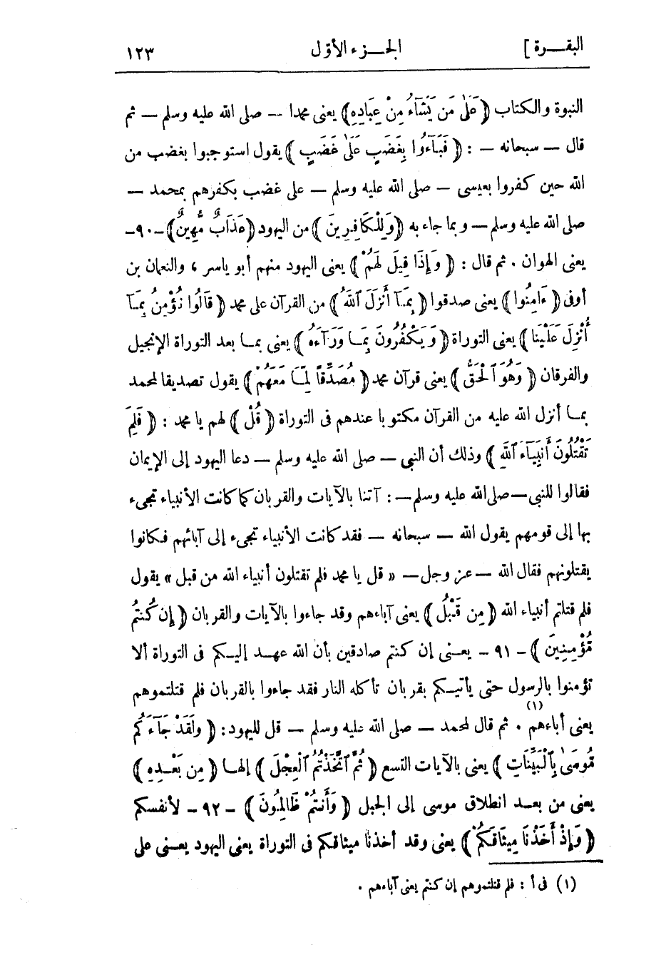 النُّبُوَّة والكتاب عَلى مَنْ يَشاءُ مِنْ عِبادِهِ يعني محمدا- صَلَّى اللَّهُ عَلَيْهِ وَسَلَّمَ- ثُمّ قال- سبحانه-: فَباؤُ بِغَضَبٍ عَلى غَضَبٍ يَقُولُ استوجبوا بغضب من اللَّه حين كفروا بعيسى- صَلَّى اللَّهُ عَلَيْهِ وَسَلَّمَ- عَلَى غضب بكفرهم بمحمد- صَلَّى اللَّهُ عَلَيْهِ وَسَلَّمَ- وبما جاء به وَلِلْكافِرِينَ من اليهود عَذابٌ مُهِينٌ- 90- يعنى الهوان. ثم قال: وَإِذا قِيلَ لَهُمْ يعني اليهود منهم أَبُو ياسر، والنعمان بن أوفي آمِنُوا يعني صدقوا بِما أَنْزَلَ اللَّهُ من القرآن عَلَى محمد قالُوا نُؤْمِنُ بِما أُنْزِلَ عَلَيْنا يعنى التوراة وَيَكْفُرُونَ بِما وَراءَهُ يعني بما بعد التوراة الإنجيل والفرقان وَهُوَ الْحَقُّ يعني قرآن محمد مُصَدِّقاً لِما مَعَهُمْ يَقُولُ تصديقا لمحمد بما أنزل اللَّه عَلَيْه من القرآن مكتوبا عندهم فِي التوراة قُلْ لهم يا محمد: فَلِمَ تَقْتُلُونَ أَنْبِياءَ اللَّهِ وذلك أن النبي- صلى الله عليه وسلم- دعا اليهود إلى الْإِيمَان فقالوا للنبي- صَلَّى اللَّهُ عَلَيْهِ وَسَلَّمَ-: آتنا بالآيات والقربان كَمَا كانت الأنبياء تجيء بها إلى قومهم يقول اللَّه- سُبْحَانَهُ- فقد كَانَت الأنبياء تجيء إلى آبائهم فكانوا يقتلونهم فقال الله- عز وجل- قُلْ يا محمد فَلِمَ تَقْتُلُونَ أَنْبِياءَ اللَّهِ مِنْ قَبْلُ يَقُولُ فلم قتلتم أنبياء اللَّه مِنْ قَبْلُ يعني آباءهم وَقَدْ جاءوا بالآيات والقربان إِنْ كُنْتُمْ مُؤْمِنِينَ- 91- يعني إن كنتم صادقين بأن اللَّه عهد إليكم فِي التوراة ألا تؤمنوا بالرسول حَتَّى يأتيكم بقربان تأكله النار فقد جاءوا بالقربان فلم قتلتموهم يعنى آباءهم «1» . ثُمّ قَالَ لمحمد- صَلَّى اللَّهُ عَلَيْهِ وَسَلَّمَ- قل لليهود: وَلَقَدْ جاءَكُمْ مُوسى بِالْبَيِّناتِ يعنى بالآيات التسع ثُمَّ اتَّخَذْتُمُ الْعِجْلَ إلها مِنْ بَعْدِهِ يعني من بعد انطلاق مُوسَى إلى الجبل وَأَنْتُمْ ظالِمُونَ- 92- لأنفسكم وَإِذْ أَخَذْنا مِيثاقَكُمْ يعني وَقَدْ أخذنا ميثاقكم فِي التوراة يعني اليهود يعنى على