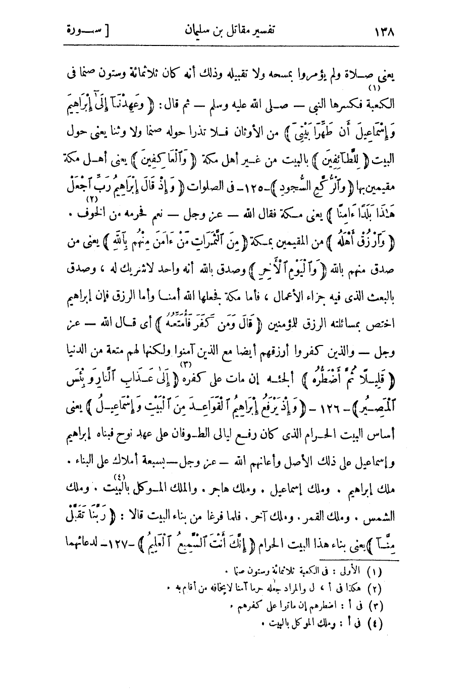 وَارْزُقْ أَهْلَهُ من المقيمين بمكة مِنَ الثَّمَراتِ مَنْ آمَنَ مِنْهُمْ بِاللَّهِ يعني من صدق منهم بِاللَّه وَالْيَوْمِ الْآخِرِ وصدق بِاللَّه أَنَّهُ واحد لا شريك لَهُ، وصدق بالبعث الَّذِي فِيهِ جزاء الأعمال، فأما مكة فجعلها اللَّه أمنا وأمّا الرزق فَإِن إِبْرَاهِيم اختص بمسائلته الرزق للمؤمنين قالَ وَمَنْ كَفَرَ فَأُمَتِّعُهُ أَي قَالَ اللَّه- عَزَّ وَجَلّ- والذين كفروا أرزقهم أيضا مَعَ الَّذِين آمنوا ولكنها لهم متعة من الدُّنْيَا قَلِيلًا ثُمَّ أَضْطَرُّهُ ألجئه إن مات عَلَى كفره «3» إِلى عَذابِ النَّارِ وَبِئْسَ الْمَصِيرُ- 126- وَإِذْ يَرْفَعُ إِبْراهِيمُ الْقَواعِدَ مِنَ الْبَيْتِ وَإِسْماعِيلُ يعني أساس البيت الحرام الَّذِي كان رفع ليالي الطوفان عَلَى عهد نوح فبناه إِبْرَاهِيم وإسماعيل عَلَى ذَلِكَ الأصل وأعانهم اللَّه- عَزَّ وَجَلّ- بسبعة أملاك على البناء.