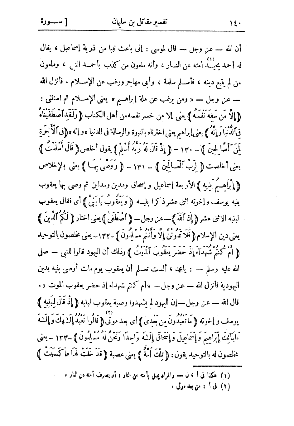 إِلَّا مَنْ سَفِهَ نَفْسَهُ يعني إِلَّا من خسر نفسه من أَهْل الكتاب وَلَقَدِ اصْطَفَيْناهُ فِي الدُّنْيا وَإِنَّهُ يعني إِبْرَاهِيم يعني اخترناه بالنبوة والرسالة فِي الدُّنْيَا وَإِنَّهُ فِي الْآخِرَةِ لَمِنَ الصَّالِحِينَ- 130- إِذْ قالَ لَهُ رَبُّهُ أَسْلِمْ يَقُولُ أخلص قالَ أَسْلَمْتُ يعني أخلصت لِرَبِّ الْعالَمِينَ- 131- وَوَصَّى بِها يعني بالإخلاص إِبْراهِيمُ بَنِيهِ الأربعة إسماعيل وإسحاق ومدين ومداين ثُمّ وصى بها يَعْقُوب بنيه يُوسُف وإخوته اثني عشر ذكرا بنيه وَيَعْقُوبُ يا بَنِيَّ أَي فَقَالَ يَعْقُوب لبنيه الاثني عشر إِنَّ اللَّهَ- عَزَّ وَجَلّ- اصْطَفى يعني اختار لَكُمُ الدِّينَ يعني دين الْإِسْلام فَلا تَمُوتُنَّ إِلَّا وَأَنْتُمْ مُسْلِمُونَ- 132- يعني مخلصون بالتوحيد أَمْ كُنْتُمْ شُهَداءَ إِذْ حَضَرَ يَعْقُوبَ الْمَوْتُ وذلك أن اليهود قالوا للنبي- صلى الله عليه وسلم-: يا محمد، ألست تعلم أن يعقوب يوم مات أوصى بنيه بدين اليهودية فأنزل الله- عز وجل- أَمْ كُنْتُمْ شُهَداءَ إِذْ حَضَرَ يَعْقُوبَ الْمَوْتُ.