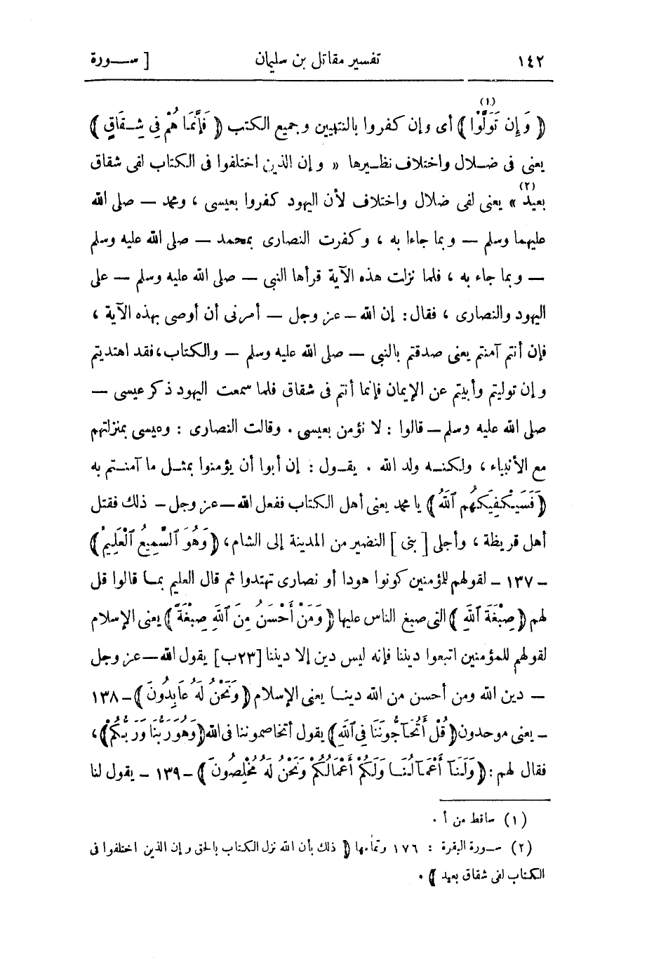 فَلَمَّا سَمِعْتُ اليهود ذكر عِيسَى- صَلَّى اللَّهُ عَلَيْهِ وَسَلَّمَ- قَالُوا: لا نؤمن بعيسى. وقالت النَّصارى: وعيسى بمنزلتهم مَعَ الْأَنْبِيَاء، ولكنه وَلَدُ اللَّه. يَقُولُ: إن أبوا أن يؤمنوا بمثل ما آمنتم به فَسَيَكْفِيكَهُمُ اللَّهُ يا محمد يعني أَهْل الكتاب ففعل اللَّه- عَزَّ وَجَلّ- ذَلِكَ فقتل أهل قريظة، وأجلى [بني] النضير من المدينة إلى الشام، وَهُوَ السَّمِيعُ الْعَلِيمُ- 137- لقولهم للمؤمنين كونوا هودا أو نصارى تهتدوا ثُمّ قَالَ العليم بما قَالُوا قل لَهُمْ صِبْغَةَ اللَّهِ التي صبغ الناس عليها وَمَنْ أَحْسَنُ مِنَ اللَّهِ صِبْغَةً يعني الْإِسْلام لقولهم للمؤمنين اتبعوا ديننا فَإنَّهُ ليس دين إلا ديننا [23 ب] يَقُولُ اللَّه- عَزَّ وَجَلّ- دين اللَّه ومن أحسن من اللَّه دينا يعني الْإِسْلام وَنَحْنُ لَهُ عابِدُونَ- 138- يعني موحدون قُلْ أَتُحَاجُّونَنا فِي اللَّهِ يَقُولُ أتخاصموننا فِي اللَّه وَهُوَ رَبُّنا وَرَبُّكُمْ، فَقَالَ لهم: وَلَنا أَعْمالُنا وَلَكُمْ أَعْمالُكُمْ وَنَحْنُ لَهُ مُخْلِصُونَ- 139- يقول لنا