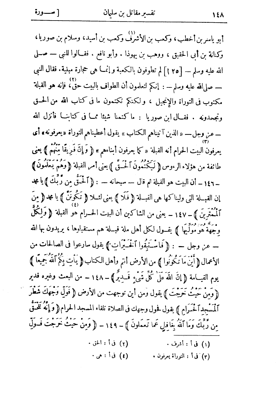 فَقَالَ ابْن صوريا: ما كتمنا شيئًا مما فِي كتابنا فأنزل اللَّه- عَزَّ وَجَلّ- الَّذِينَ آتَيْناهُمُ الْكِتابَ يَقُولُ أعطيناهم التوراة يَعْرِفُونَهُ أَي يعرفون «3» البيت الحرام أَنَّهُ القبلة كَما يَعْرِفُونَ أَبْناءَهُمْ وَإِنَّ فَرِيقاً مِنْهُمْ يعني طائفة من هَؤُلاءِ الرءوس لَيَكْتُمُونَ الْحَقَّ يعني أمر القبلة وَهُمْ يَعْلَمُونَ- 146- أن البيت هُوَ القبلة ثُمّ قَالَ- سُبْحَانَهُ-: الْحَقُّ مِنْ رَبِّكَ يا محمد إن القبلة التي وليناكها هِيَ القبلة فَلا يعني لئلا تَكُونَنَّ يا محمد مِنَ الْمُمْتَرِينَ- 147- يعنى من الشاكين أن البيت الحرام هو «4» القبلة لِكُلٍّ وِجْهَةٌ هُوَ مُوَلِّيها