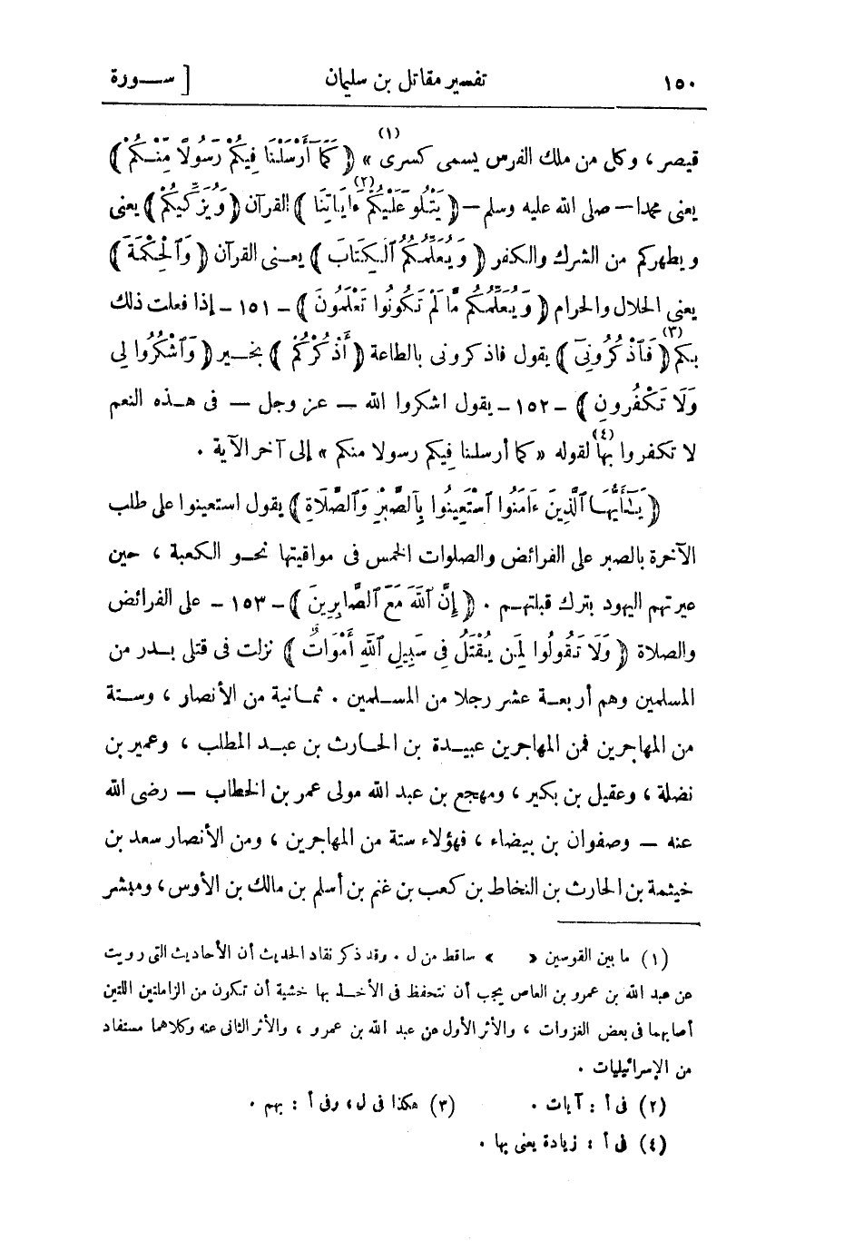 يا أَيُّهَا الَّذِينَ آمَنُوا اسْتَعِينُوا بِالصَّبْرِ وَالصَّلاةِ يَقُولُ استعينوا عَلَى طلب الآخرة بالصبر عَلَى الفرائض والصلوات الخمس فِي مواقيتها نحو الكعبة، حين عيرتهم اليهود بترك قبلتهم. إِنَّ اللَّهَ مَعَ الصَّابِرِينَ- 153- عَلَى الفرائض والصلاة وَلا تَقُولُوا لِمَنْ يُقْتَلُ فِي سَبِيلِ اللَّهِ أَمْواتٌ نزلت فِي قتلى بدر من الْمُسْلِمِين وهم أربعة عشر رَجُلا من الْمُسْلِمِين. ثمانية من الأَنْصَار، وستة من المهاجرين فَمن المهاجرين عُبَيْدة بن الْحَارِث بن عَبْد الْمُطَّلِب، وعمير بن نضلة، وعقيل بن بكير، ومهجع بن عبد اللَّه مَوْلَى عُمَر بن الخَطَّاب- رَضِيَ اللَّه عَنْهُ- وصفوان بن بيضاء، فهؤلاء ستة من المهاجرين، ومن الأنصار سعد بن خيثمة بن الْحَارِث بن النخاط بن كَعْب بن غَنْم بن أسلم بن مَالِك بن الأوس، ومبشر