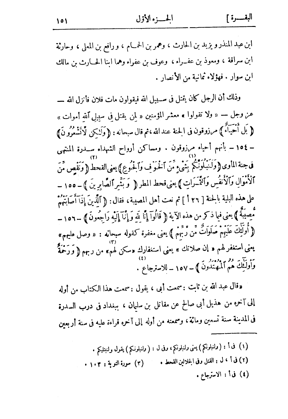 وذلك أن الرَّجُل كان يقتل فِي سبيل اللَّه فيقولون مات فُلان فأنزل اللَّه- عَزَّ وَجَلّ- وَلا تَقُولُوا مَعْشَر الْمُؤْمِنِين لِمَنْ يُقْتَلُ فِي سَبِيلِ اللَّهِ أَمْواتٌ بَلْ أَحْياءٌ مرزوقون فِي الجنة عِنْد اللَّه، ثُمّ قَالَ سُبْحَانَهُ: وَلكِنْ لا تَشْعُرُونَ- 154- بأنهم أحياء مرزوقون. ومساكن أرواح الشهداء سدرة المنتهى فِي جنة المأوى وَلَنَبْلُوَنَّكُمْ «1» بِشَيْءٍ مِنَ الْخَوْفِ وَالْجُوعِ يعني القحط «2» وَنَقْصٍ مِنَ الْأَمْوالِ وَالْأَنْفُسِ وَالثَّمَراتِ يعني قحط المطر وَبَشِّرِ الصَّابِرِينَ- 155- عَلَى هَذِهِ البلية بالجنة [26 أ] ثُمّ نعت أَهْل المصيبة، فَقَالَ: الَّذِينَ إِذا أَصابَتْهُمْ مُصِيبَةٌ يعني فيما ذُكِرَ مِنْ هَذِهِ الآية قالُوا إِنَّا لِلَّهِ وَإِنَّا إِلَيْهِ راجِعُونَ- 156- أُولئِكَ عَلَيْهِمْ صَلَواتٌ مِنْ رَبِّهِمْ يعني مغفرة كقوله سُبْحَانَهُ: وَصَلِّ عَلَيْهِمْ يعني استغفر لهم إِنَّ صَلاتَكَ يعني استغفارك سَكَنٌ لَهُمْ «3» من ربهم وَرَحْمَةٌ وَأُولئِكَ هُمُ الْمُهْتَدُونَ- 157- للاسترجاع «4» .