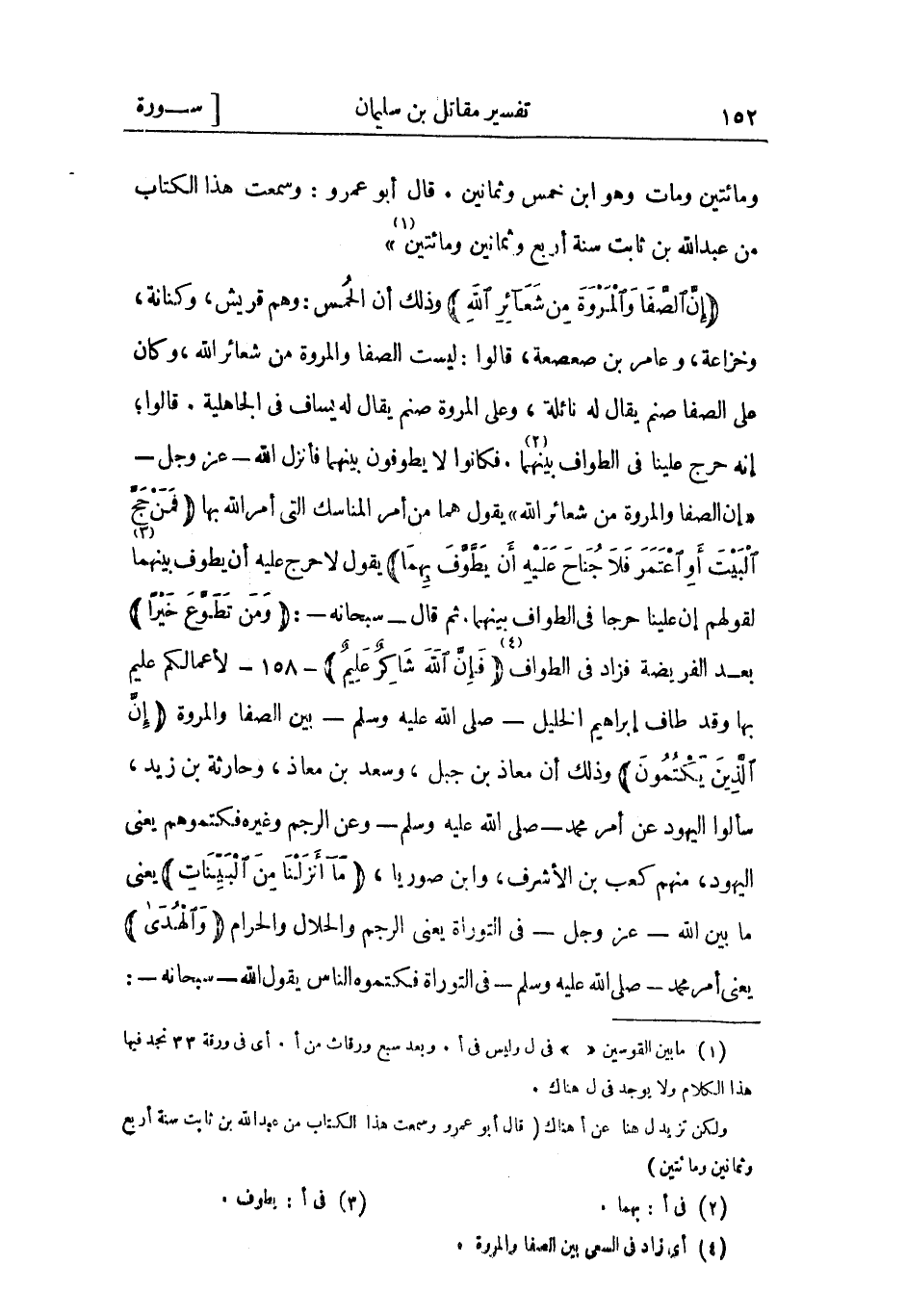 ومائتين ومات وهو ابن خمس وثمانين. قال أبو عمرو: وسمعت هذا الكتاب من عبد الله بن ثابت سنة أربع وثمانين ومائتين» «1» إِنَّ الصَّفا وَالْمَرْوَةَ مِنْ شَعائِرِ اللَّهِ وذلك أن الخمس: وهم قريش، وكنانة، وخزاعة، وعامر بن صعصعة، قَالُوا: ليست الصفا والمروة من شعائر اللَّه، وكان عَلَى الصفا صنم يُقَالُ لَهُ نائلة، وعلى المروة صنم يُقَالُ لَهُ يسَاف فِي الْجَاهِلِيَّة. قَالُوا، إنَّه حرج علينا فِي الطواف بَيْنَهُمَا «2» . فكانوا لا يطوفون بَيْنَهُمَا فأنزل اللَّه- عَزَّ وَجَلّ- إِنَّ الصَّفا وَالْمَرْوَةَ مِنْ شَعائِرِ اللَّهِ يَقُولُ هما من أمر المناسك التي أمر اللَّه بها فَمَنْ حَجَّ الْبَيْتَ أَوِ اعْتَمَرَ فَلا جُناحَ عَلَيْهِ أَنْ يَطَّوَّفَ بِهِما يَقُولُ لا حرج عَلَيْه أن يطوف بَيْنَهُمَا «3» لقولهم إن علينا حرجا فِي الطواف بَيْنَهُمَا. ثُمّ قَالَ- سُبْحَانَهُ-: وَمَنْ تَطَوَّعَ خَيْراً بعد الفريضة فزاد فِي الطواف «4» فَإِنَّ اللَّهَ شاكِرٌ عَلِيمٌ- 158- لأعمالكم عليم بها وَقَدْ طاف إِبْرَاهِيم الخليل- عليه السلام- بين الصفا والمروة إِنَّ الَّذِينَ يَكْتُمُونَ وذلك أن مُعَاذ بن جبل، وسعد بن مُعَاذ، وحارثة بن زَيْد، سألوا اليهود عن أمر محمد- صَلَّى اللَّهُ عَلَيْهِ وَسَلَّمَ- وعن الرجم وغيره فكتموهم يعني اليهود، منهم كَعْب بن الأشرف، وابن صوريا، ما أَنْزَلْنا مِنَ الْبَيِّناتِ يعني ما بين اللَّه- عَزَّ وَجَلّ- فِي التوراة يعني الرجم والحلال والحرام وَالْهُدى يعني أمر محمد- صلى الله عليه وسلم- في التوراة فكتموه الناس يقول الله- سبحانه-: