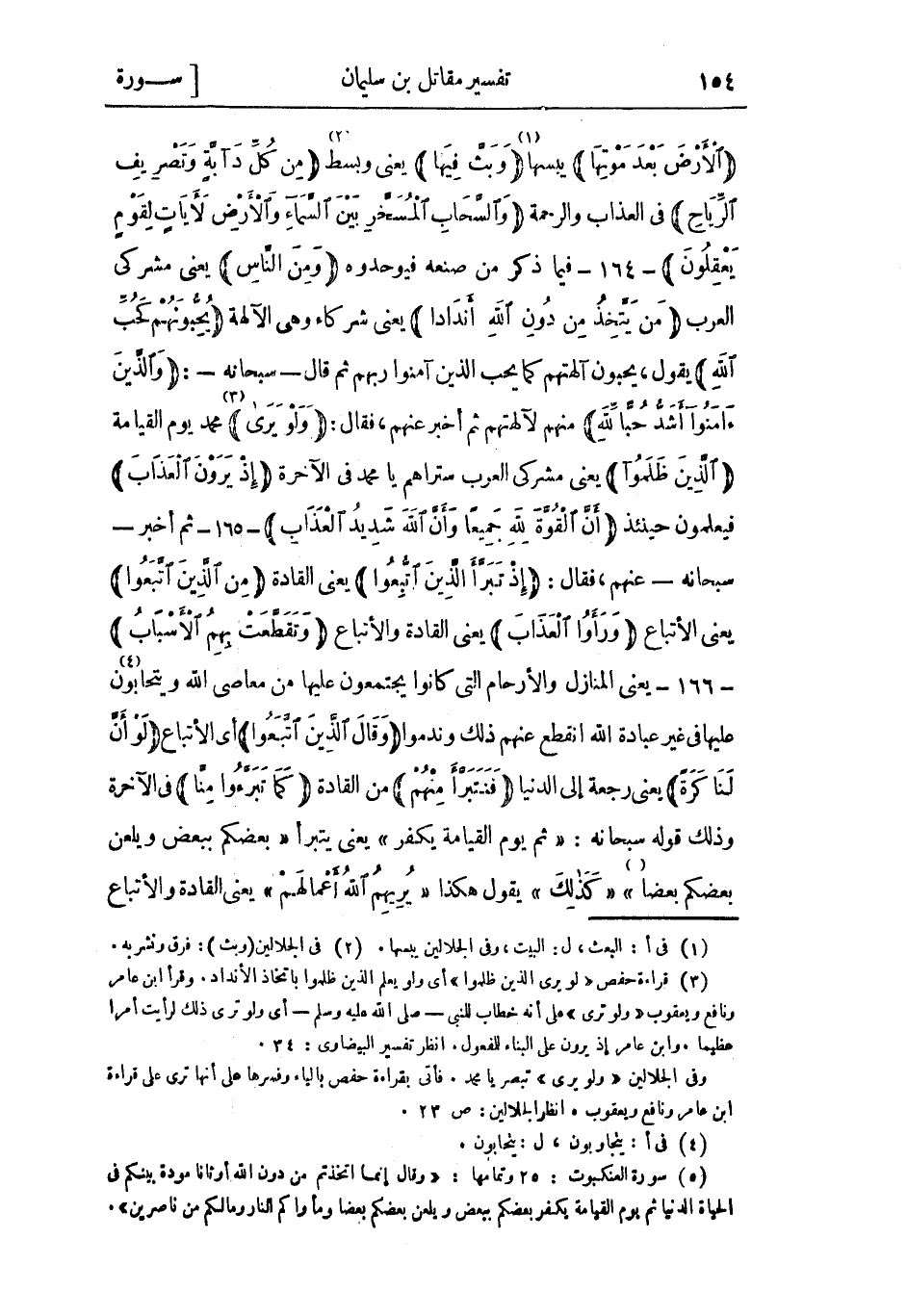 الْأَرْضَ بَعْدَ مَوْتِها يبسها «1» وَبَثَّ فِيها يعني وبسط «2» مِنْ كُلِّ دَابَّةٍ وَتَصْرِيفِ الرِّياحِ فِي العذاب والرحمة وَالسَّحابِ الْمُسَخَّرِ بَيْنَ السَّماءِ وَالْأَرْضِ لَآياتٍ لِقَوْمٍ يَعْقِلُونَ- 164- فيما ذُكِرَ مَنْ صنعه فيوحدوه وَمِنَ النَّاسِ يعني مشركي العرب مَنْ يَتَّخِذُ مِنْ دُونِ اللَّهِ أَنْداداً يعني شركاء وهي الآلهة يُحِبُّونَهُمْ كَحُبِّ اللَّهِ يَقُولُ، يحبون آلهتهم كَمَا يحب الَّذِين آمنوا ربهم ثُمّ قَالَ- سُبْحَانَهُ-: وَالَّذِينَ آمَنُوا أَشَدُّ حُبًّا لِلَّهِ منهم لآلهتهم ثُمّ أخبر عَنْهُمْ، فَقَالَ: وَلَوْ يَرَى «3» محمد يوم الْقِيَامَة الَّذِينَ ظَلَمُوا يعني مشركي العرب ستراهم يا محمد فِي الآخرة إِذْ يَرَوْنَ الْعَذابَ فيعلمون حينئذ أَنَّ الْقُوَّةَ لِلَّهِ جَمِيعاً وَأَنَّ اللَّهَ شَدِيدُ الْعَذابِ- 165- ثُمّ أخبر- سُبْحَانَهُ- عَنْهُمْ، فَقَالَ: إِذْ تَبَرَّأَ الَّذِينَ اتُّبِعُوا يعني القادة مِنَ الَّذِينَ اتَّبَعُوا يعني الأتباع وَرَأَوُا الْعَذابَ يعني القادة والأتباع وَتَقَطَّعَتْ بِهِمُ الْأَسْبابُ- 166- يعني المنازل والأرحام التي كانوا يجتمعون عَلَيْهَا من معاصي اللَّه ويتحابون «4» عَلَيْهَا فِي غَيْر عبادة اللَّه انقطع عَنْهُمْ ذَلِكَ وندموا وَقالَ الَّذِينَ اتَّبَعُوا أَي الأتباع لَوْ أَنَّ لَنا كَرَّةً يعني رجعة إلى الدُّنْيَا فَنَتَبَرَّأَ مِنْهُمْ من القادة كَما تَبَرَّؤُا مِنَّا فِي الآخرة وذلك قوله سُبْحَانَهُ: ثُمَّ يَوْمَ الْقِيامَةِ يَكْفُرُ يعني يتبرأ بَعْضُكُمْ بِبَعْضٍ وَيَلْعَنُ بَعْضُكُمْ بَعْضاً «5» كَذلِكَ يَقُولُ هكذا يُرِيهِمُ اللَّهُ أَعْمالَهُمْ يعني القادة والأتباع