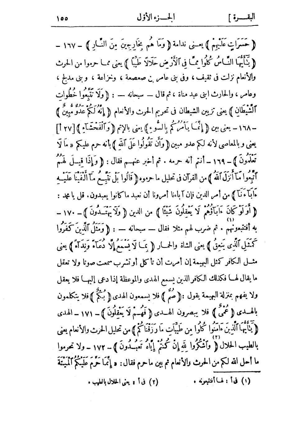 حَسَراتٍ عَلَيْهِمْ يعني ندامة وَما هُمْ بِخارِجِينَ مِنَ النَّارِ- 167- يا أَيُّهَا النَّاسُ كُلُوا مِمَّا فِي الْأَرْضِ حَلالًا طَيِّباً يعني مما حرموا من الحرث والأنعام نزلت فِي ثقيف، وَفِي بني عامر بن صعصعه، وخزاعة، وبني مدلج، وعامر، والحارث ابني عَبْد مناة، ثُمّ قَالَ- سُبْحَانَهُ-: وَلا تَتَّبِعُوا خُطُواتِ الشَّيْطانِ يعني تزيين الشَّيْطَان فِي تحريم الحرث والأنعام إِنَّهُ لَكُمْ عَدُوٌّ مُبِينٌ- 168- يعني بين إِنَّما يَأْمُرُكُمْ بِالسُّوءِ يعني بالإثم وَالْفَحْشاءِ [27 أ] يعني وبالمعاصي لأنه لَكُمْ عدو مبين وَأَنْ تَقُولُوا عَلَى اللَّهِ بأنه حرم عليكم ما لا تَعْلَمُونَ