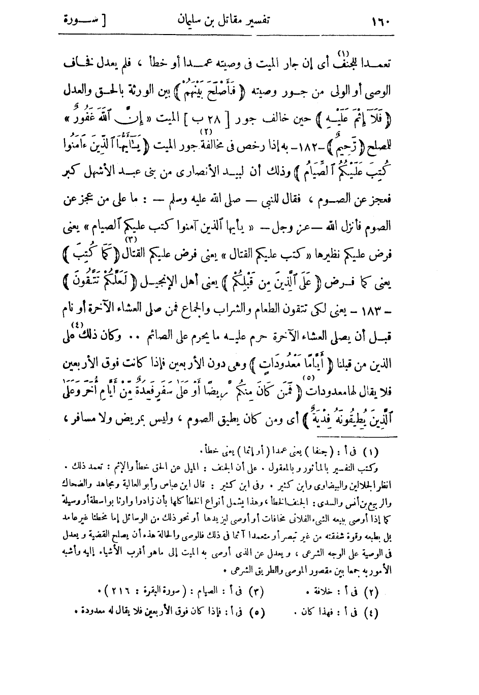 تعمدا للجنف «1» أَي إن جار الميت فِي وصيته عمدا أَوْ خطأ، فلم يعدل فخاف الوصي أَو الولي من جور وصيته فَأَصْلَحَ بَيْنَهُمْ بين الورثة بالحق والعدل فَلا إِثْمَ عَلَيْهِ حين خالف جور [28 ب] الميت إِنَّ اللَّهَ غَفُورٌ للمصلح رَحِيمٌ- 182- به إذا رخص فى مخالفة «2» جور الميت يا أَيُّهَا الَّذِينَ آمَنُوا كُتِبَ عَلَيْكُمُ الصِّيامُ وذلك