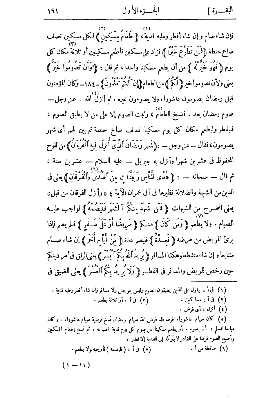 فَإِن شاء صام وإن شاء أفطر وعليه فدية «1» ، طَعامُ مِسْكِينٍ «2» لكل مسكين نصف صاع حنطة فَمَنْ تَطَوَّعَ خَيْراً فزاد عَلَى مسكين فأطعم مسكينين أَوْ ثلاثة «3» مكان كُلّ يوم فَهُوَ خَيْرٌ لَهُ من أن يطعم مسكينا واحدًا، ثُمّ قَالَ: وَأَنْ تَصُومُوا خَيْرٌ يعني ولأن تصوموا خير لَكُمْ من الطعام إِنْ كُنْتُمْ تَعْلَمُونَ- 184- وكان المؤمنون قبل رمضان يصومون عاشوراء وَلا يصومون غيره. ثُمّ أنزل «4» اللَّه- عَزَّ وَجَلّ- صوم رمضان بعد. فنسخ الطعام «5» ، وثبت الصوم إِلَّا عَلَى من لا يطيق الصوم فليفطر وليطعم مكان كُلّ يوم مسكينا نصف صاع حنطة ثُمّ بين لهم أي شهر يصومون، فَقَالَ- عَزَّ وَجَلّ-: شَهْرُ رَمَضانَ الَّذِي أُنْزِلَ فِيهِ الْقُرْآنُ من اللوح المحفوظ فِي عشرين شهرا وأنزل به جبريل- عَلَيْه السَّلام- عشرين سنة، ثُمّ قَالَ- سبحانه-: هُدىً لِلنَّاسِ وَبَيِّناتٍ مِنَ الْهُدى «6» وَالْفُرْقانِ يعني فِي الدّين من الشبهة والضلالة نظيرها فى آل عمران الآية 4 وَأَنْزَلَ الْفُرْقانَ من قبل يعني المخرج من الشبهات فَمَنْ شَهِدَ مِنْكُمُ الشَّهْرَ فَلْيَصُمْهُ فواجب عَلَيْه الصِّيَام. وَلا يطعم «7» وَمَنْ كانَ منكم مَرِيضاً أَوْ عَلى سَفَرٍ فلم يصم فإذا برىء المريض من مرضه فَعِدَّةٌ فليصم عدة مِنْ أَيَّامٍ أُخَرَ إن شاء صام متتابعا وإن شاء متقطعا وهكذا المسافر يُرِيدُ اللَّهُ بِكُمُ الْيُسْرَ يعني الرفق فِي أمر دينكم حين رخص للمريض والمسافر فِي الفطر وَلا يُرِيدُ بِكُمُ الْعُسْرَ يعنى الضيق فى