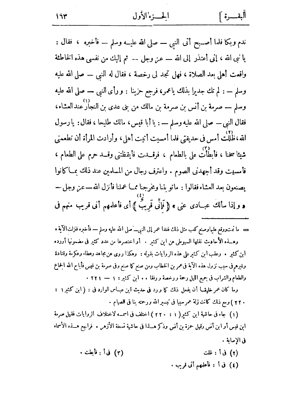 أو اختصرها من عدد كثير فى مضمونها أورده ابن كثير، وعقب ابن كثير على هذه الروايات بقوله: وهكذا روى عن مجاهد وعطاء وعكرمة وقتادة وغيرهم فى سبب نزول هذه الآية فى عمر بن الخطاب ومن صنع كما صنع وفى صرمة بن قيس فأباح الله الجماع والطعام والشراب فى جميع الليل رحمة ورخصة ورفقا.. ابن كثير: 1- 221.