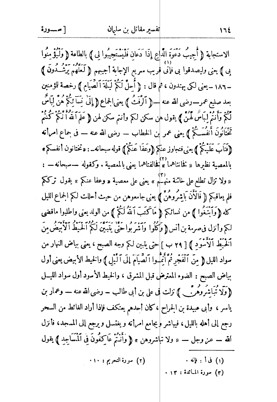 وَلا تَزالُ تَطَّلِعُ عَلى خائِنَةٍ مِنْهُمْ «3» يعني عَلَى معصية وَعَفا عَنْكُمْ يَقُولُ ترككم فلم يعاقبكم فَالْآنَ بَاشِرُوهُنَّ يعني جامعوهن من حيث أحللت لَكُم الجماع الليل كله وَابْتَغُوا من نسائكم ما كَتَبَ اللَّهُ لَكُمْ من الولد يعني واطلبوا ما قضى لَكُمْ وأنزل فِي صرمة بن أنس وَكُلُوا وَاشْرَبُوا حَتَّى يَتَبَيَّنَ لَكُمُ الْخَيْطُ الْأَبْيَضُ مِنَ الْخَيْطِ الْأَسْوَدِ [29 ب] حَتَّى يتبين لَكُمْ وجه الصبح، يعني بياض النهار من سواد الليل مِنَ الْفَجْرِ ثُمَّ أَتِمُّوا الصِّيامَ إِلَى اللَّيْلِ والخيط الأبيض يعني أول بياض الصبح: الضوء المعترض قبل المشرق، والخيط الأسود أول سواد الليل وَلا تُبَاشِرُوهُنَّ نزلت فِي عَلِيّ بْن أبي طَالِب- رَضِيَ اللَّه عَنْهُ- وعمار بن ياسر، وأبي عُبَيْدة بن الجراح، كان أحدهم يعتكف فإذا أراد الغائط من السحر رجع إلى أهله بالليل، فيباشر ويجامع امرأته ويغتسل ويرجع إلى المسجد، فأنزل اللَّه- عَزَّ وَجَلّ- وَلا تُبَاشِرُوهُنَّ وَأَنْتُمْ عاكِفُونَ فِي الْمَساجِدِ يقول