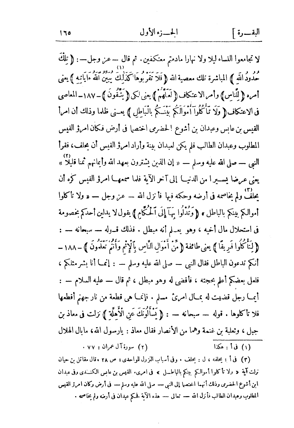 (3) فى أ: يحلفه، ل: يحلف. وفى أسباب النزول للواحدي: ص 28، قال مقاتل بن حيان نزلت آية وَلا تَأْكُلُوا أَمْوالَكُمْ بَيْنَكُمْ بِالْباطِلِ فى امرئ القيس بن عابس الكندي وفى عبدان ابن أشوع الحضرمي وذلك إنهما اختصما إلى النَّبِيّ- صَلَّى اللَّهُ عَلَيْهِ وسلم- في أرض وكان امرؤ القيس المطلوب وعبدان الطالب فأنزل الله- تعالى- هذه الآية فحكم عبدان فى أرضه ولم يخاصمه.