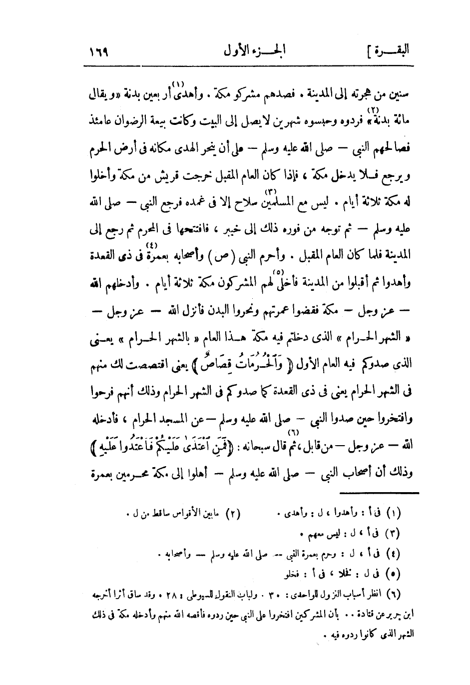 (6) انظر أسباب النزول للواحدي: 30. ولباب النقول للسيوطي: 28. وقد ساق أثرا أخرجه ابن جرير عن قتادة.. بأن المشركين افتخروا على النبي حين ردوه فأقصه الله منهم وأدخله مكة فى ذلك الشهر الذي كانوا ردوه فيه. [.....]